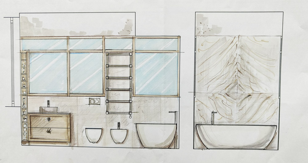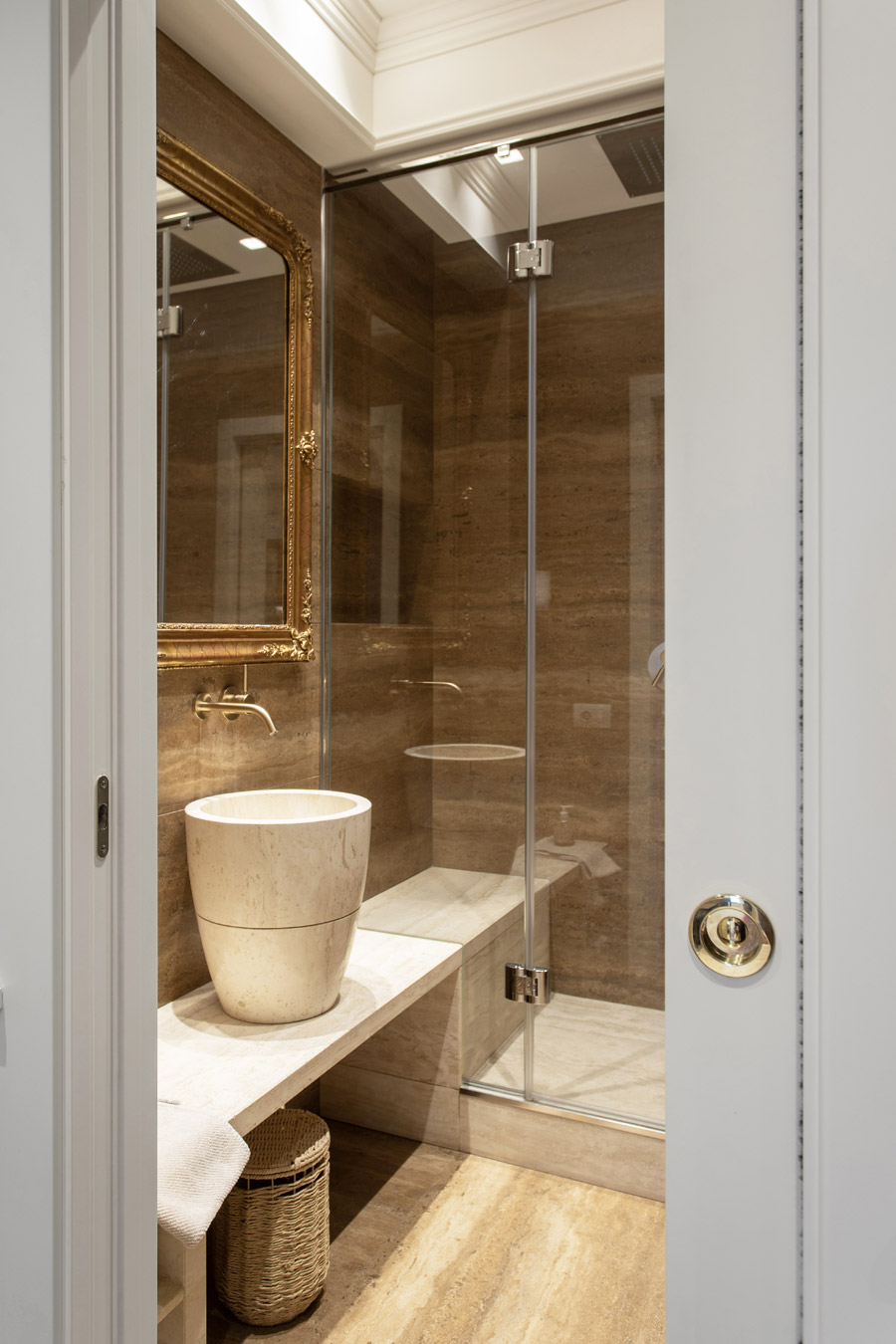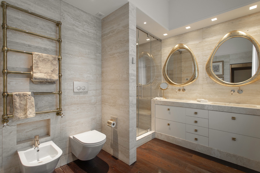 Bagno padronale rivestito in travertino. Specchiere di Spini e rubinetterie Gessi.