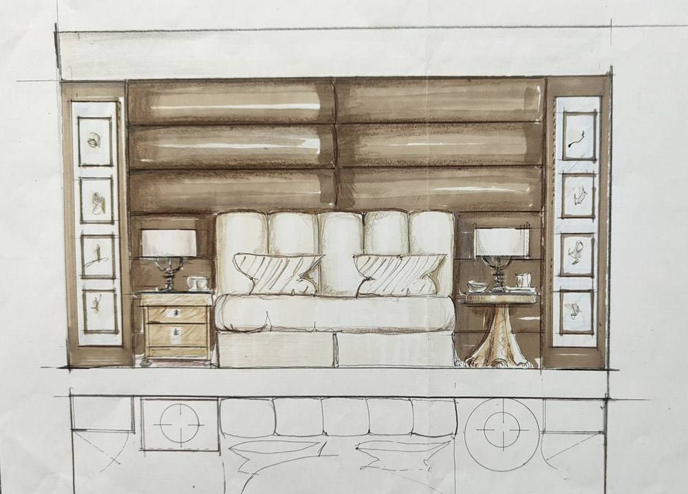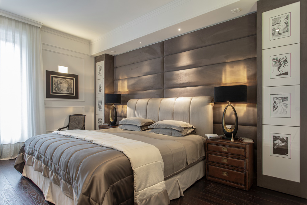 La camera padronale ospita un importante letto la cui testata risalta sulla parete tessile imbottita. Ai lati del letto contenitori caratterizzati da opere grafiche originale di F. Visintin.