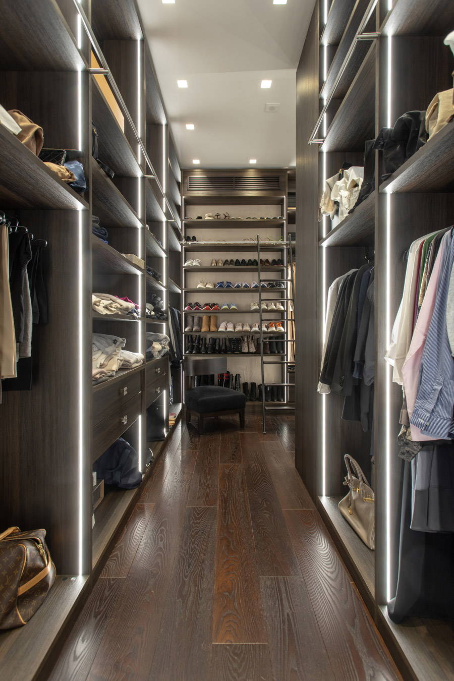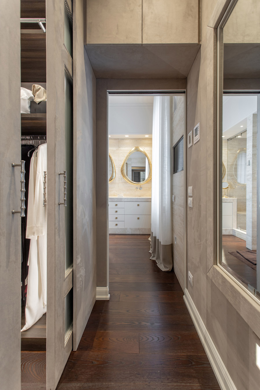 Attiguo alla camera l’ampio articolato closet realizzato a misura in essenza con fondali rivestiti in microfibra come le pareti.