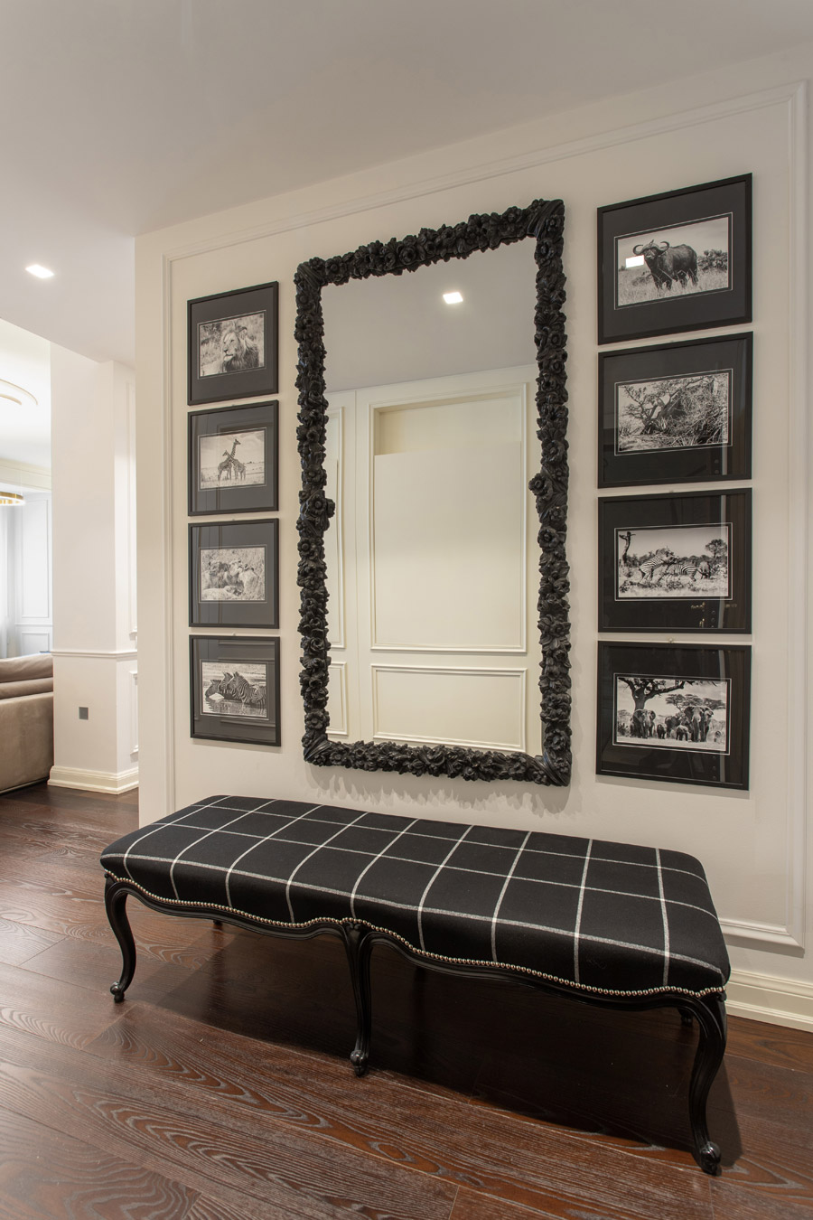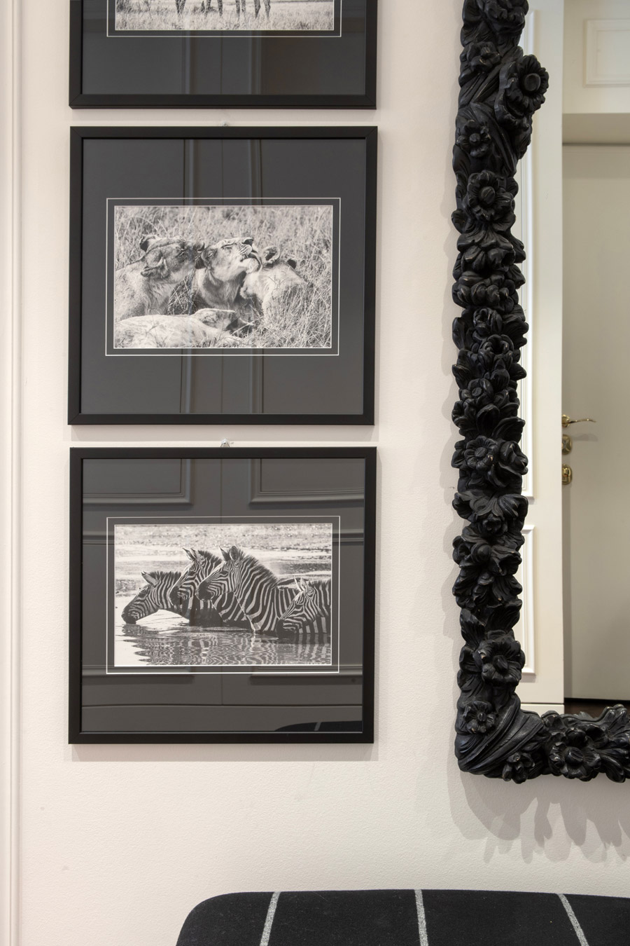 L’ingresso è caratterizzato da una singolare specchiera in legno intagliato (Spini) affiancata da opere Wild Photo Nature di F. dell’Acqua.