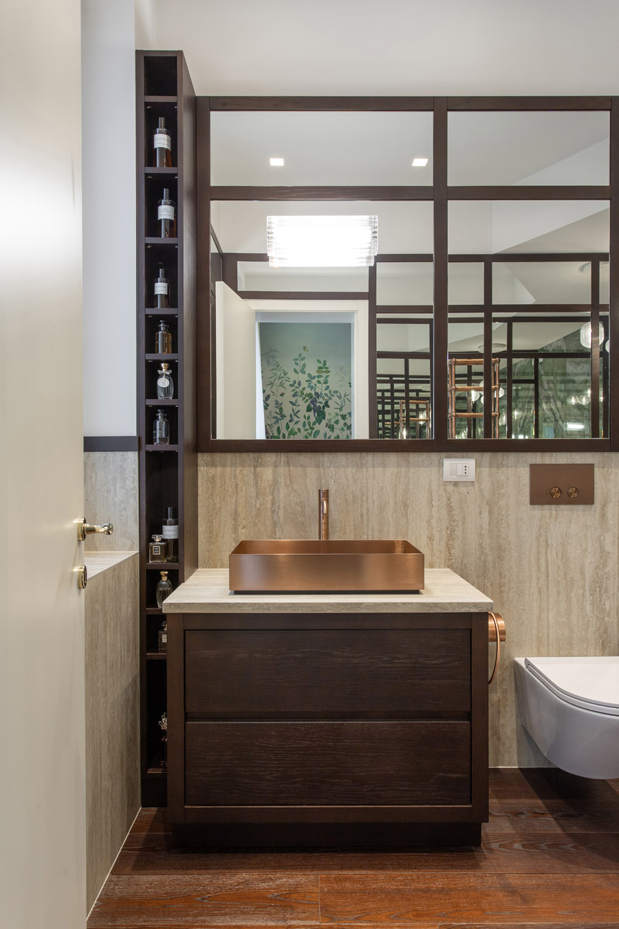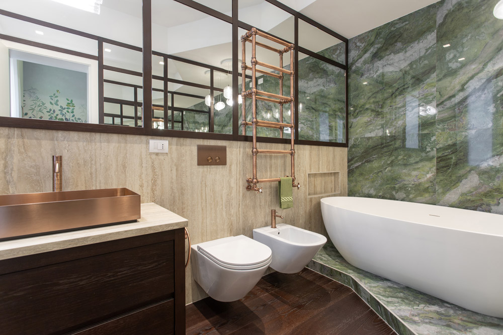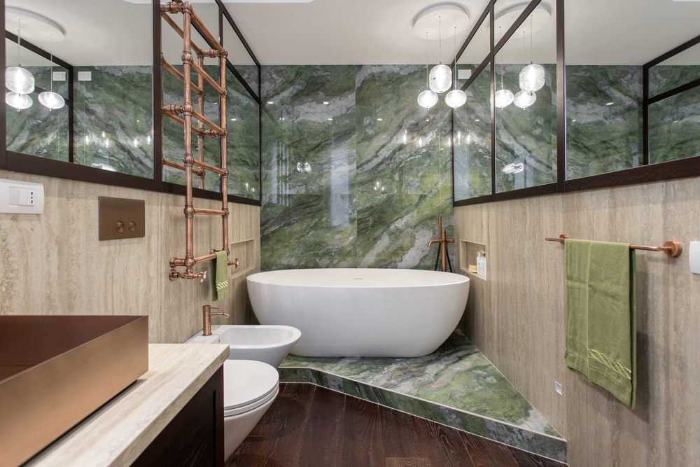 Attigua alla camera il bagno con la parete di fondo realizzata in gres Irish Green lucidato che fa da quinta all’ampia vasca. Il lavabo in rame è di Gessi come in rame è la finitura delle rubinetterie. Sospensioni in vetro di Lodes.