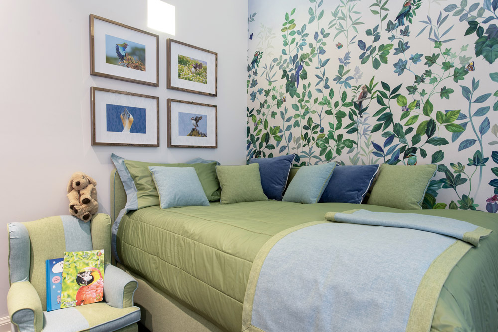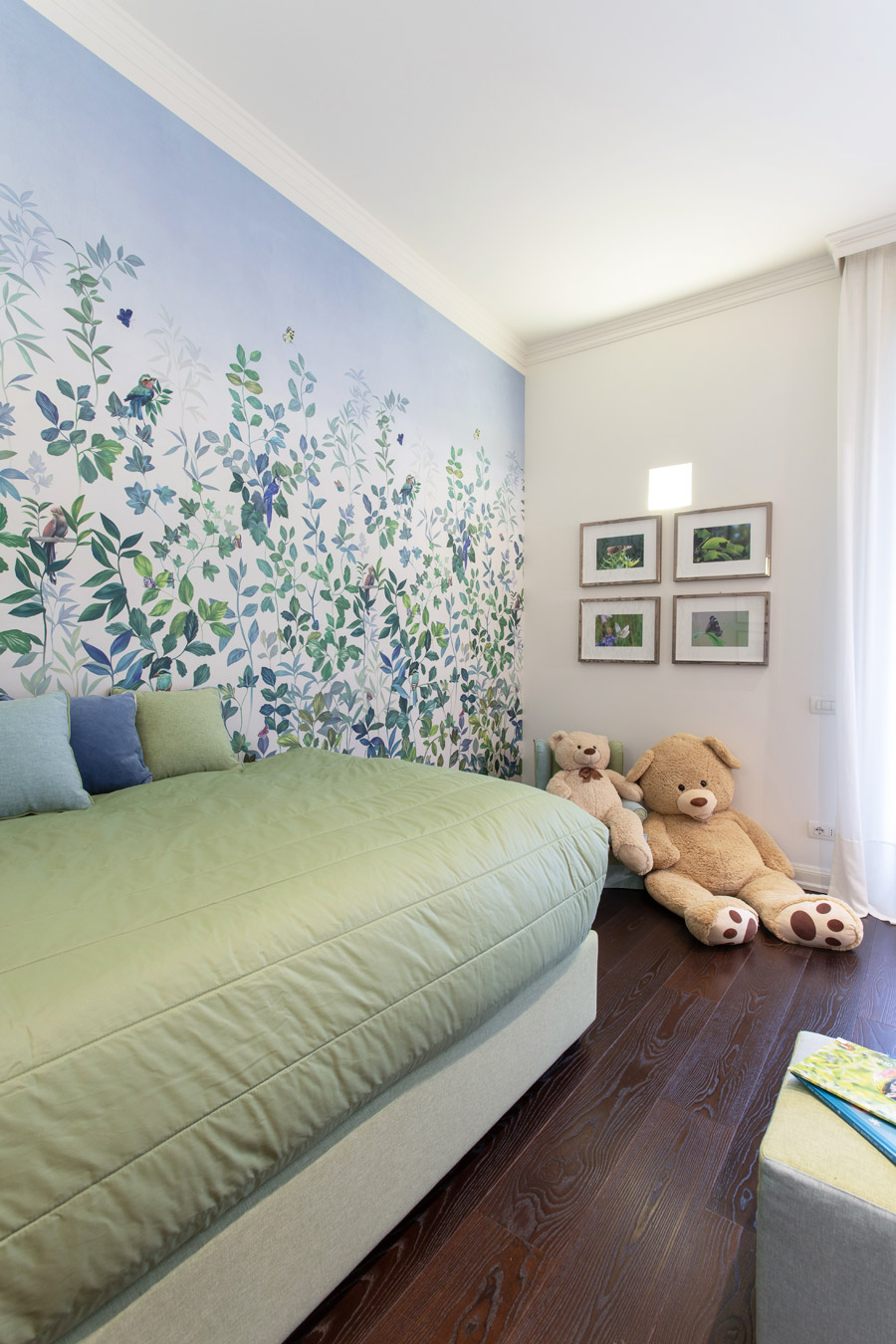 Sul lato opposto del corridoio si affaccia la camera della bimba decorata con tappezzeria a motivi naturalistici floreali (designer Guild Voliere), foto Wild Photo Nature di F. dell’Acqua.