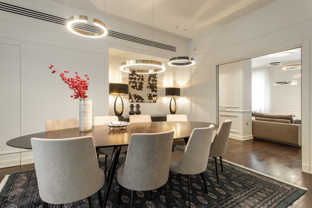 Una zona pranzo indipendente ma in dialogo con il soggiorno, arricchita da pezzi d’autore e materiali naturali per un’atmosfera sofisticata e accogliente.