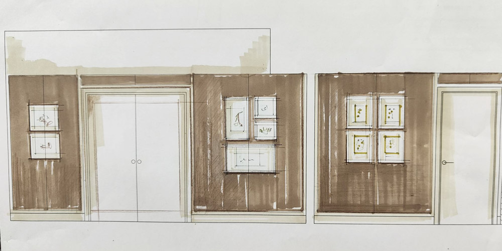 Alle pareti rivestimenti in fibra naturale (di CMO) che mettono in risalto le opere dell’artista P. Zoffoli e le stampe di Masson.