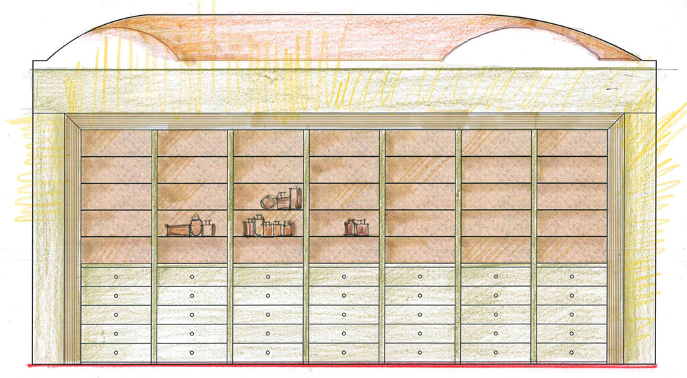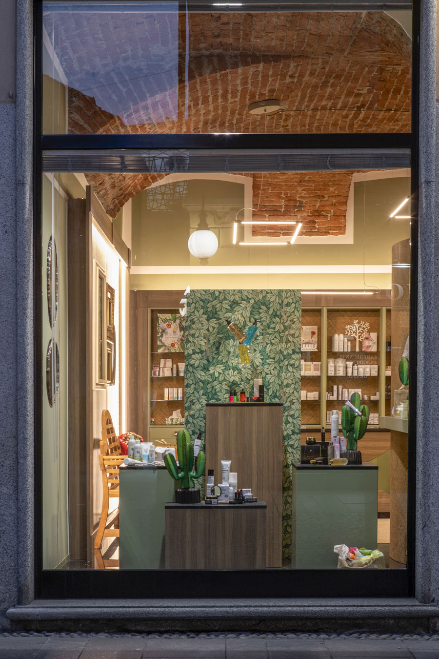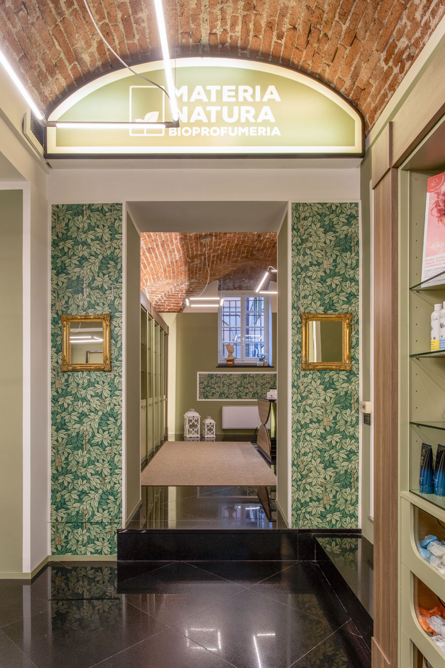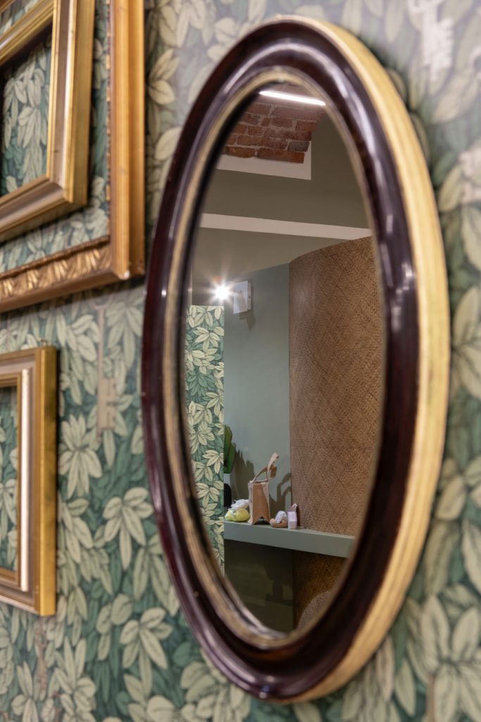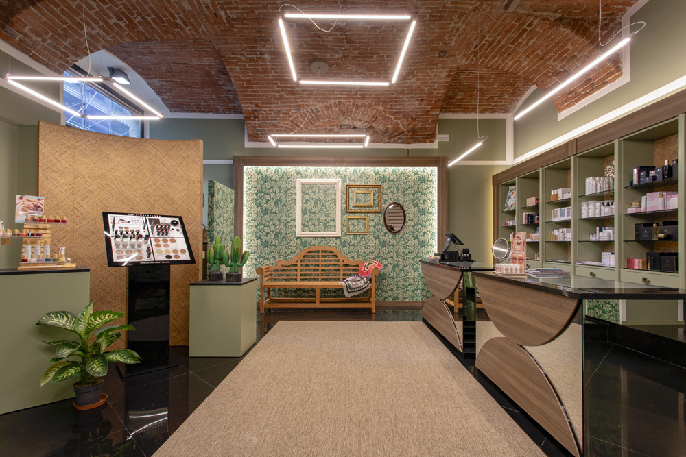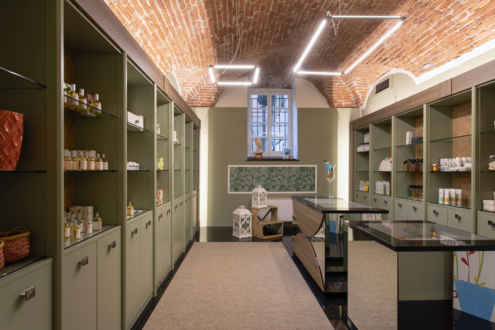 Gli elementi espositivi color verde salvia, sottolineati da una cornice in rovere e lo sfondo rivestito in paglia intrecciata, sono illuminati a cappello in modo da valorizzare ancor di più le volte.