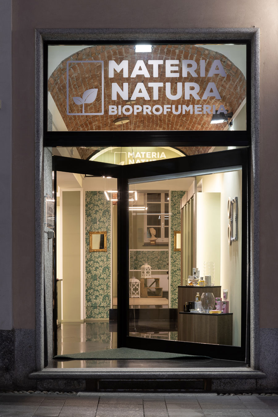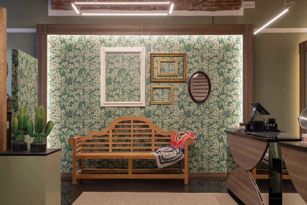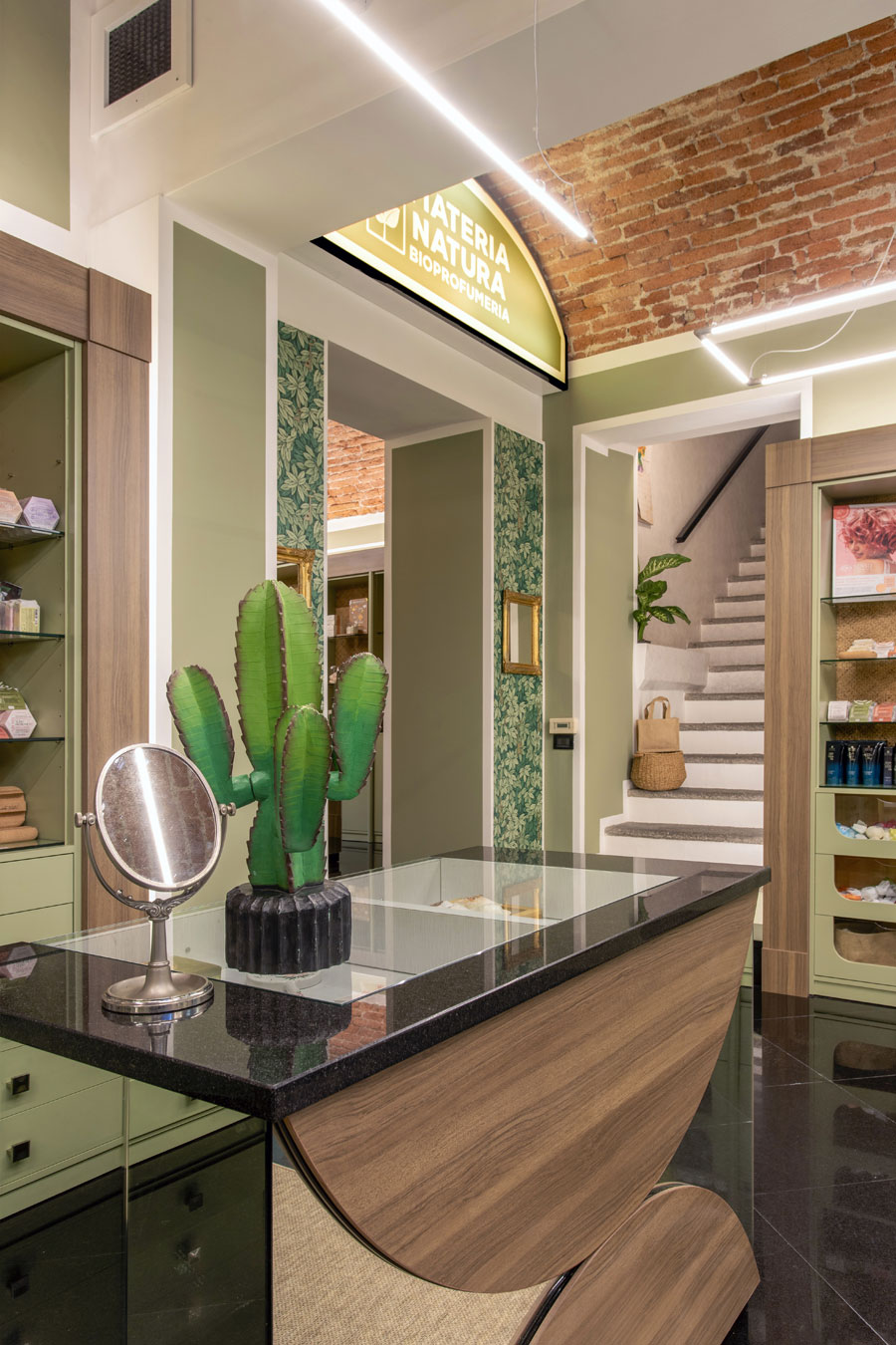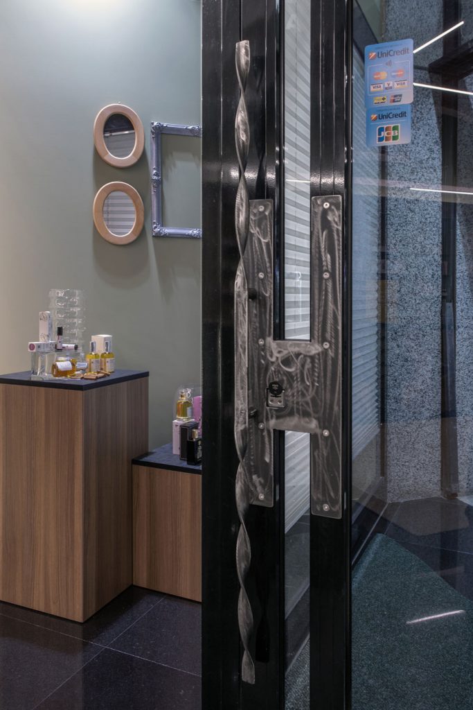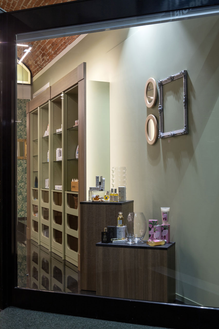 I banchi – vendita sono rivestiti in specchio con mezzelune in rovere ambrato come le cornici dei mobili espositivi.