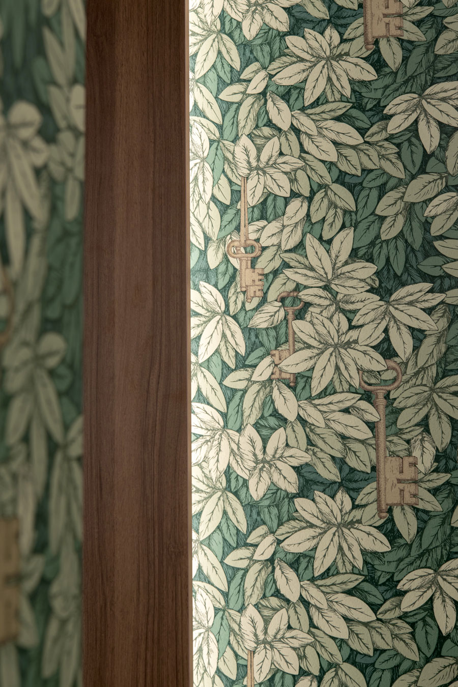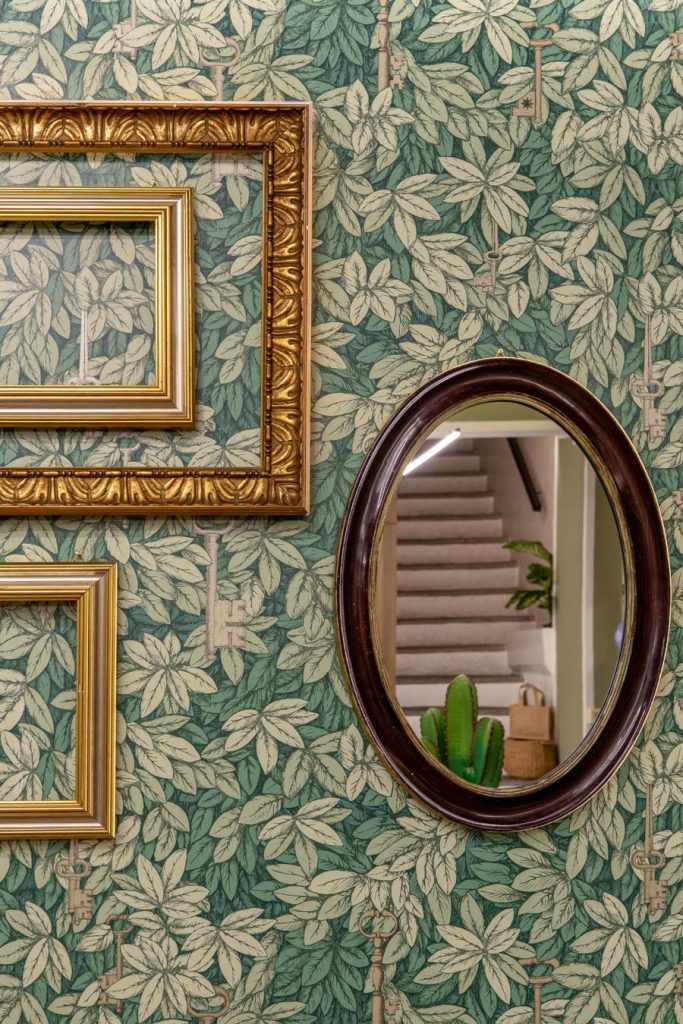 La tappezzeria di Fornasetti, che troviamo in diverse zone, entra come elemento decorativo richiamante la filosofia dello spazio.