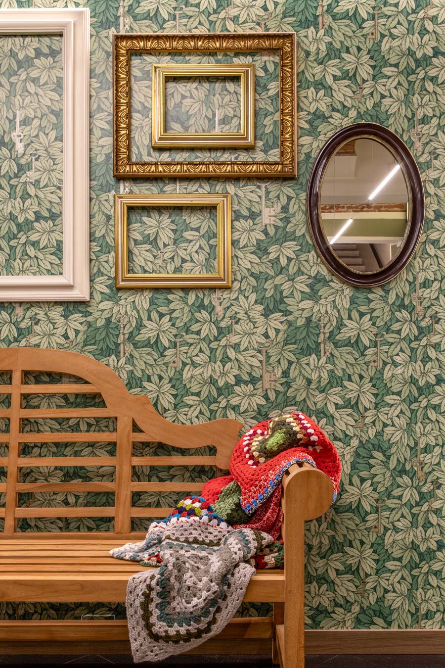 Il sapore di “Giardino di inverno” viene sottolineato ancor di più dalla presenza di una panca in teak di inglese memoria, specchi e cornici dorate d’epoca completano il decoro delle pareti.