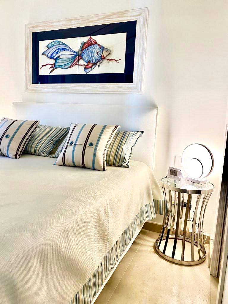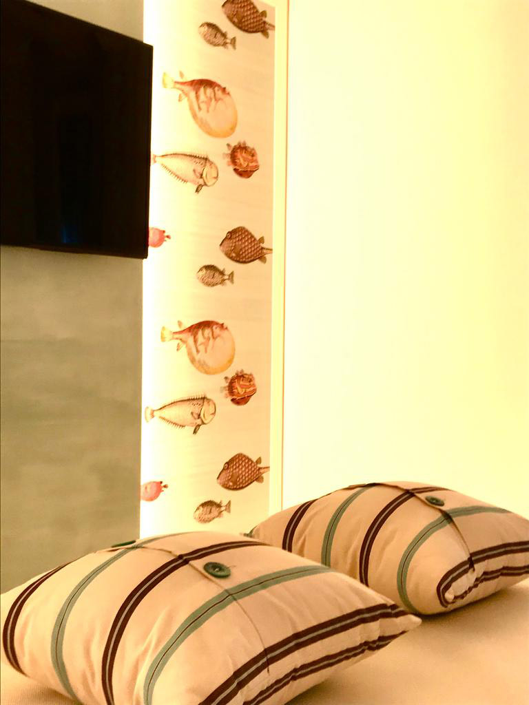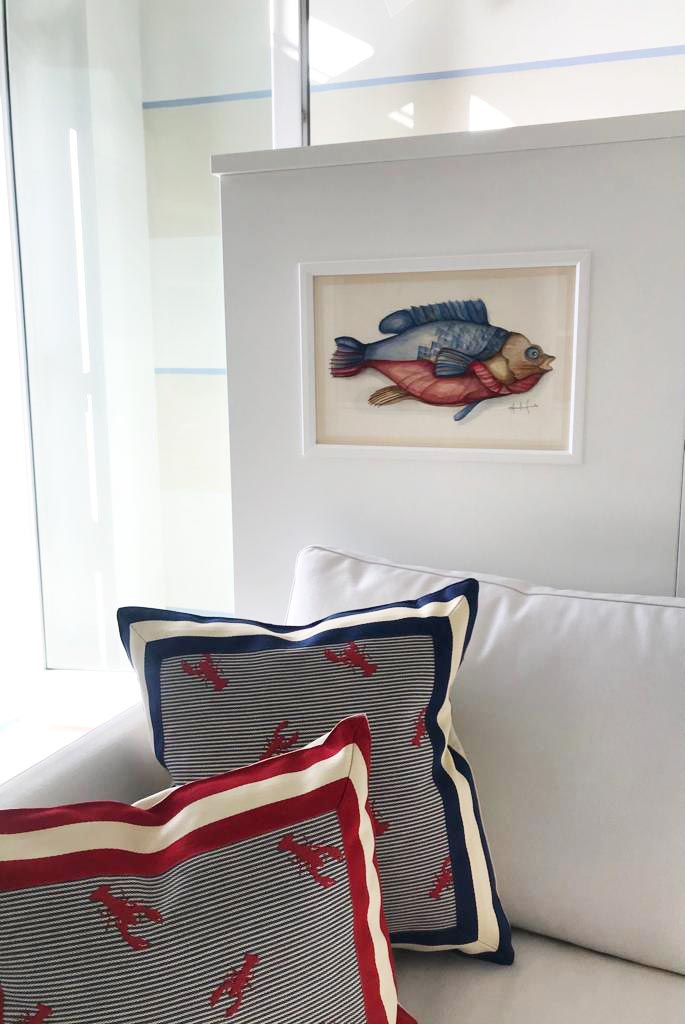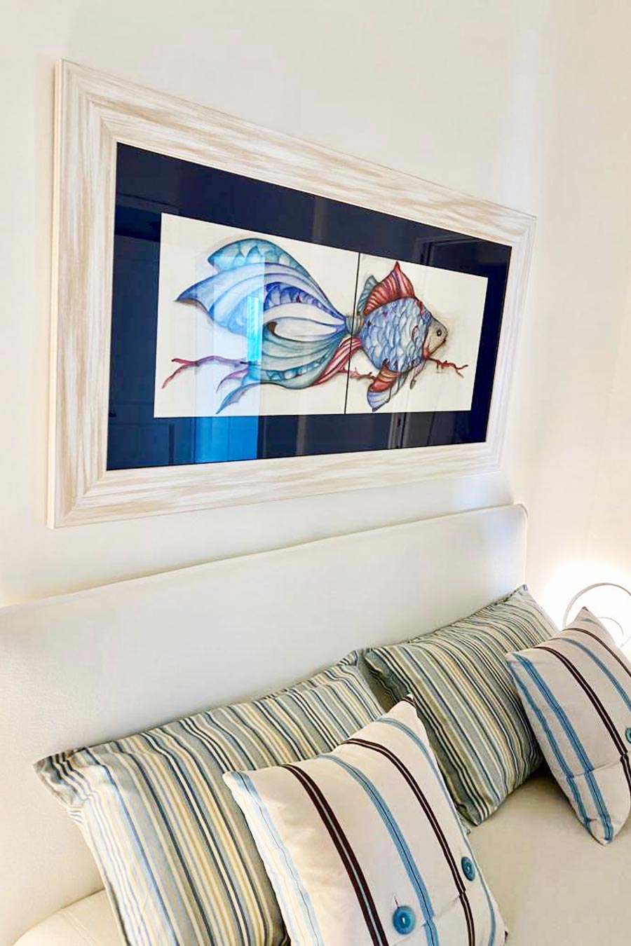 La camera padronale: il letto, rivestito in lino bianco con cuscini a contrasto, è posizionato di fronte a due pannelli retroilluminati rivestiti con tappezzeria Fornasetti, sempre con il tema del pesce, che si riprende nell’acquarello capo letto sempre eseguito dall’architetto.