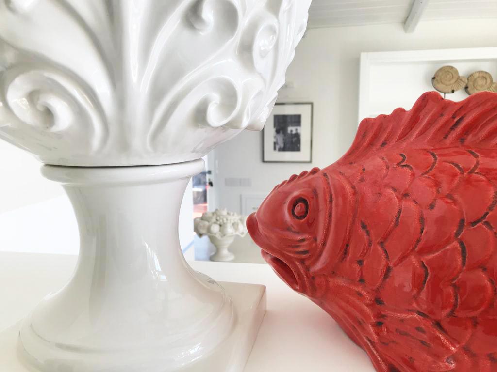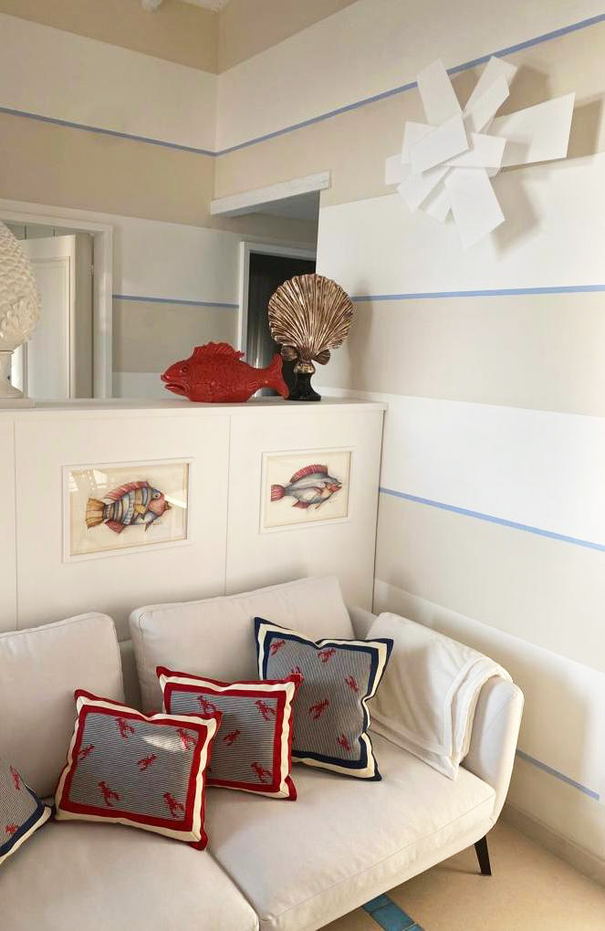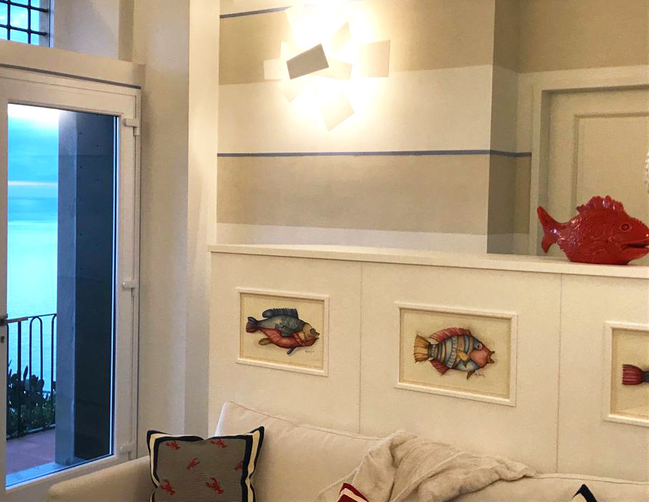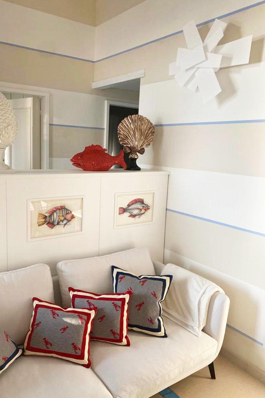La boiserie laccata che compone il soggiorno è realizzata su disegno, come anche il mobile retro divano dove sono stati posizionati acquarelli di pesci eseguiti dall’architetto.