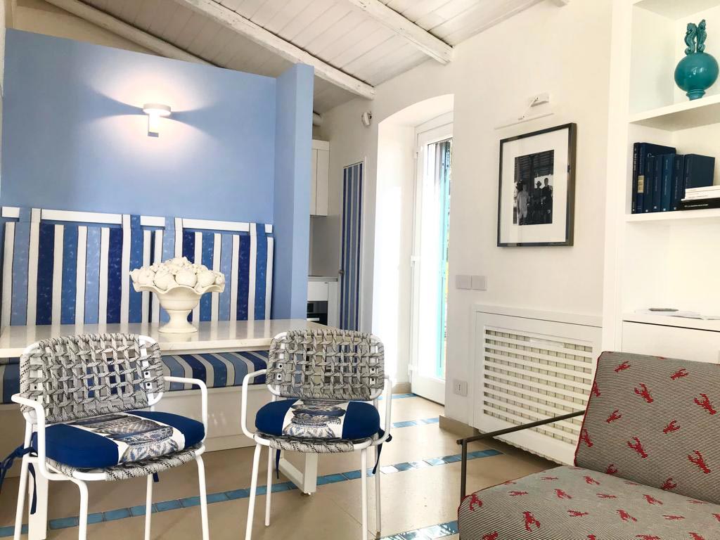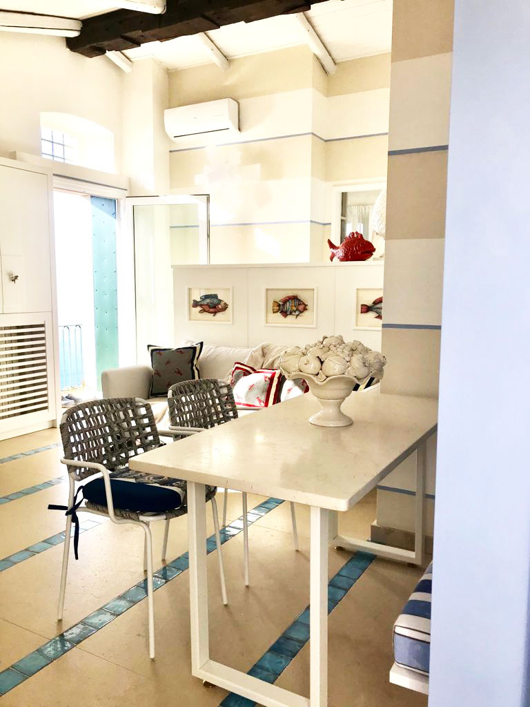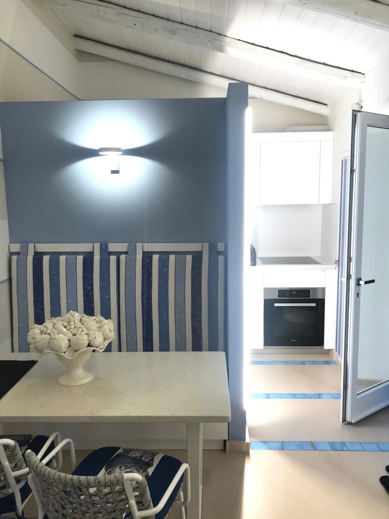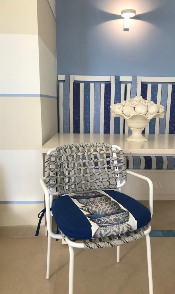 La cucina è lievemente obliata dalla zona giorno da una quinta azzurra dove è stata posizionata la panca della zona pranzo formata da cuscinoni rivestiti in tessuto a righe che riprendono i colori della casa .