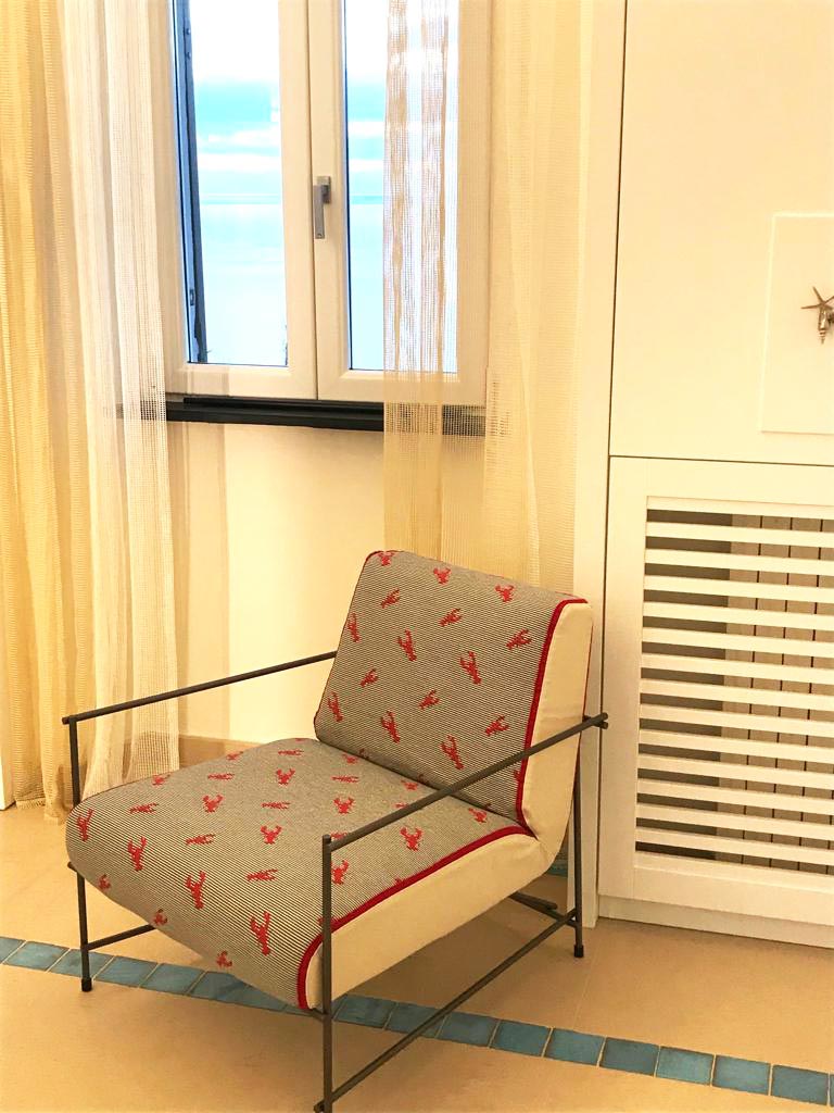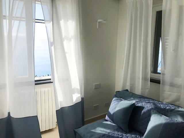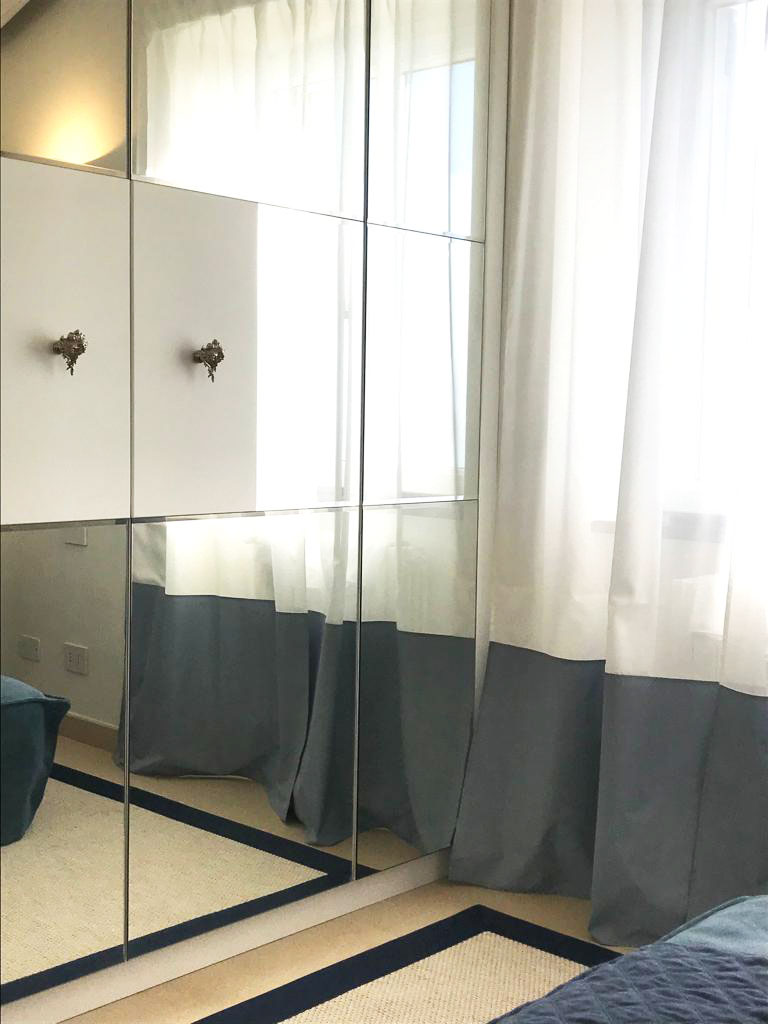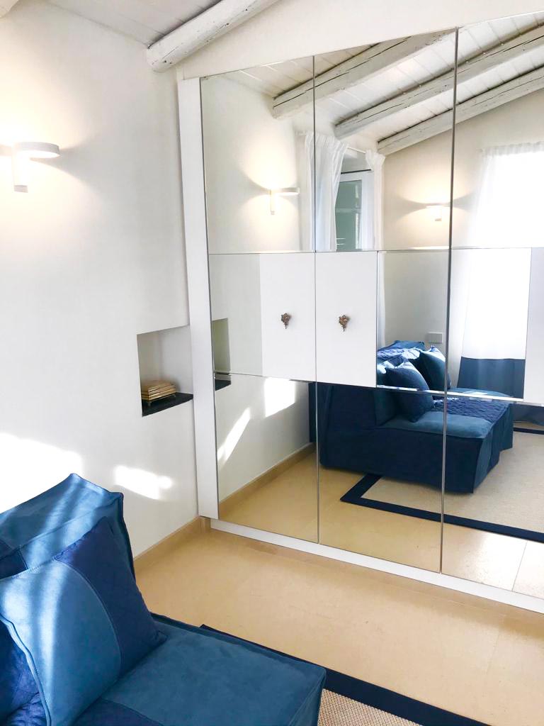 La camera degli ospiti presenta le armadiature con ante in vetro bisellato che riflettono le finestre che danno sul mare.