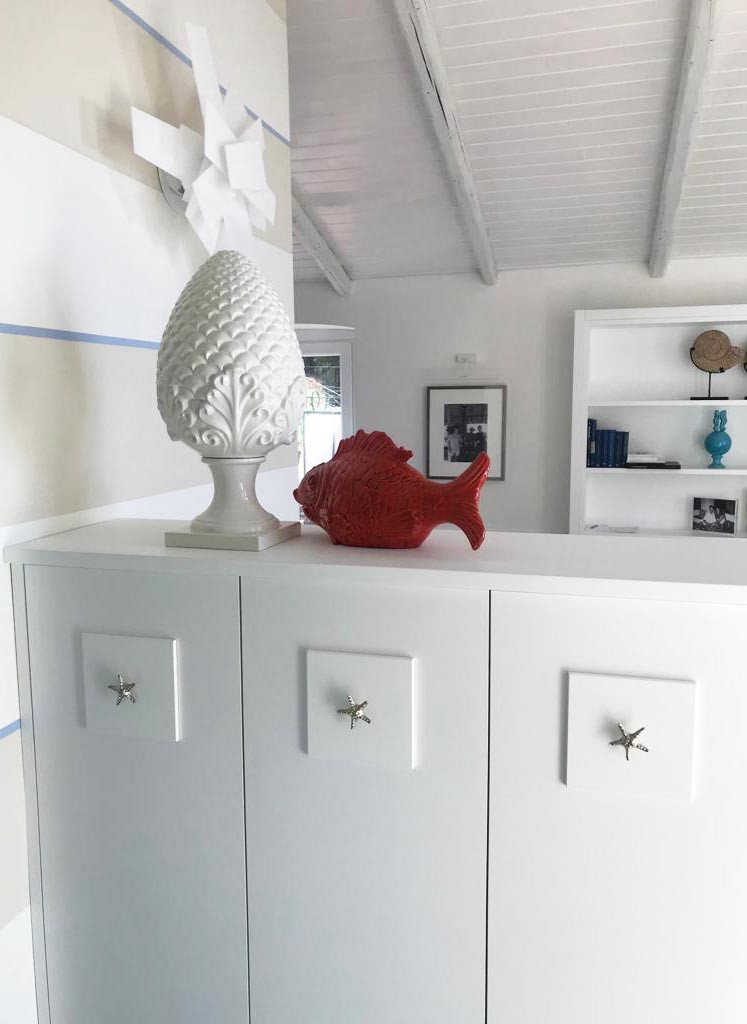 La parte verso la zona notte è ad ante con maniglie in fusione a tema marino.
