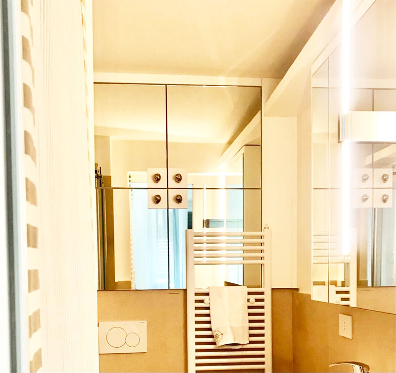 Armadi a specchio con maniglie a conchiglia rendono l’ambiente piu ampio.