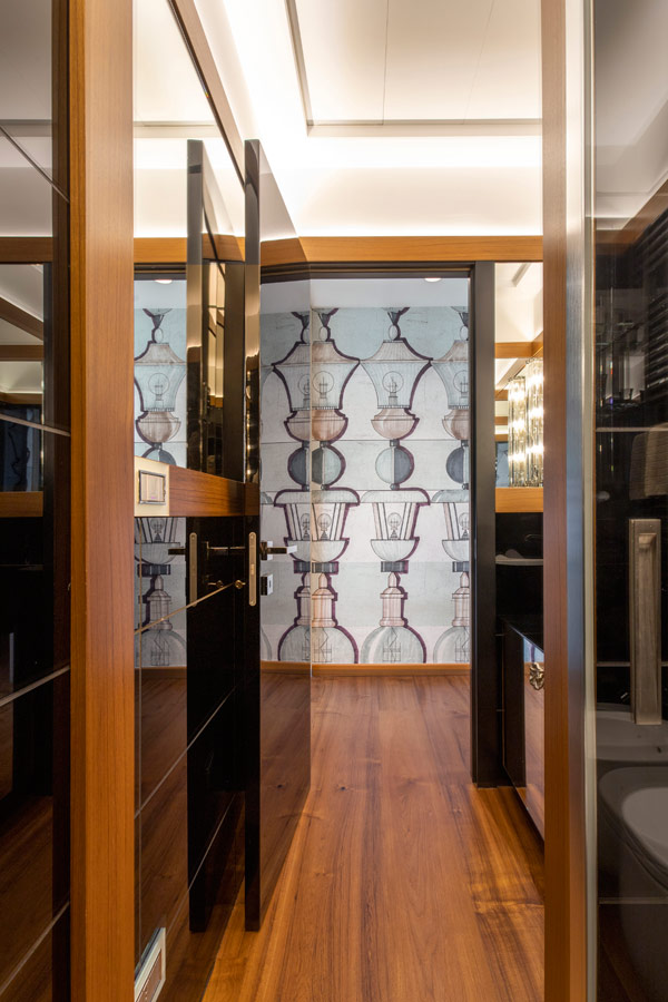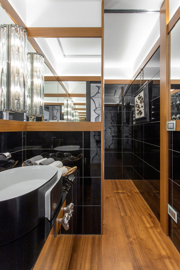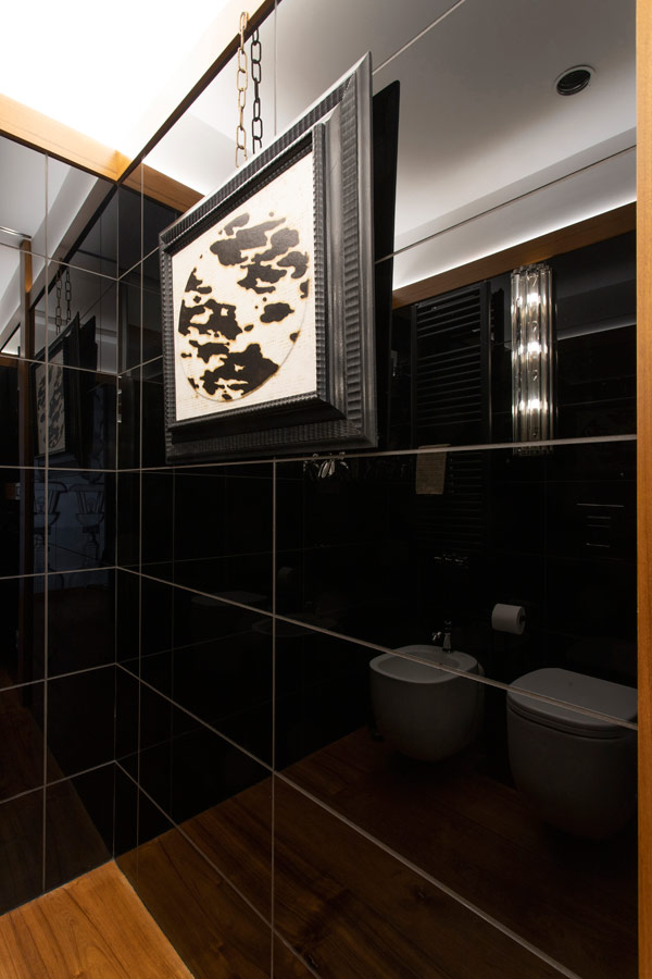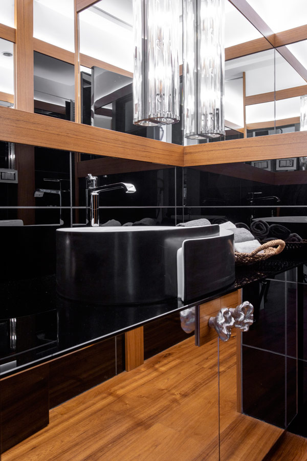 Attiguo alla cucina il bagno che serve la zona giorno dove prosegue la pavimentazione in teak e le pareti sono rivestite in lastre di vetro nero e specchio con riquadrature in legno della stessa essenza del pavimento.