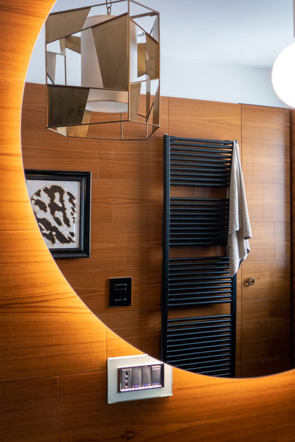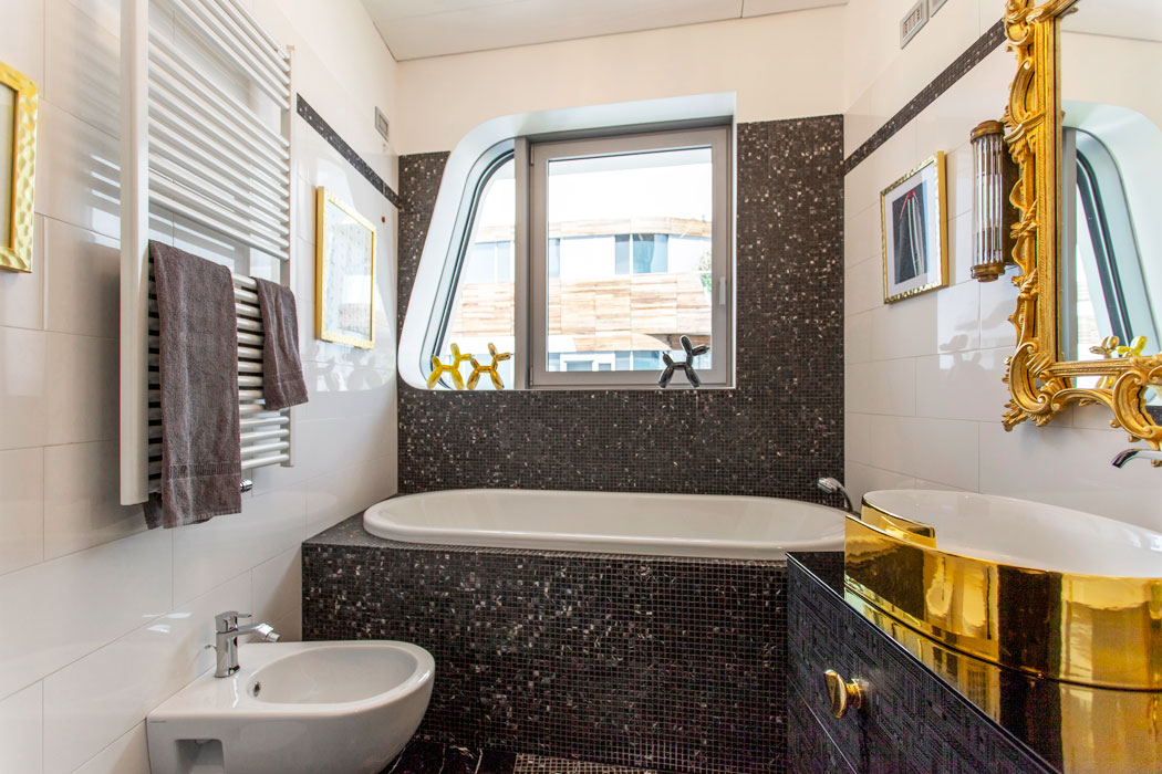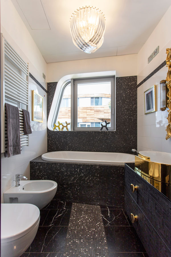 Il bagno padronale, attiguo alla camera, presenta, senza soluzione di continuità, lo stesso cromatismo della camera.