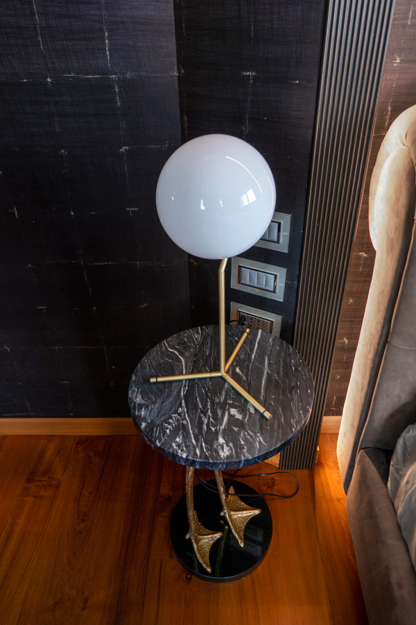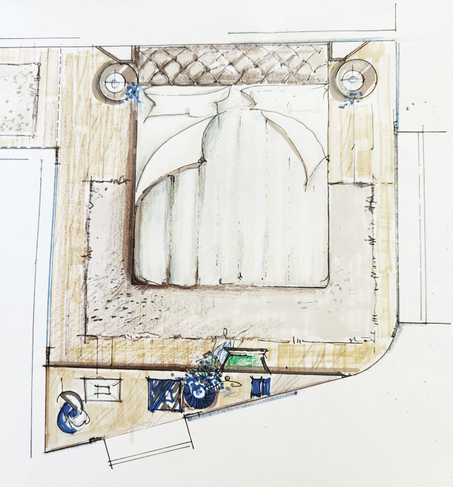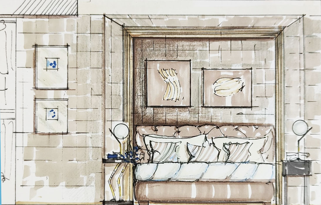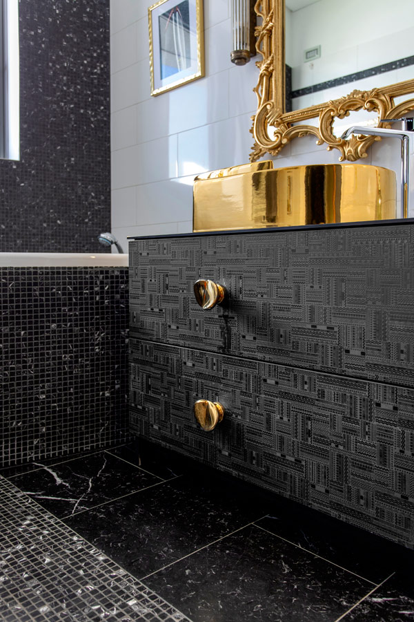 Anche la nicchia che fa da cornice alla testata del letto (Baxter) ha lo stesso motivo.