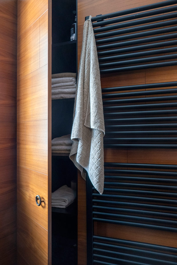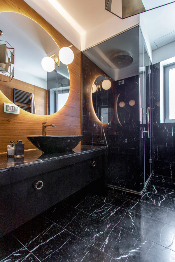 Pavimento in marmo Nero Marquinia come il lavabo realizzato artigianalmente (Ricci Marmi), pareti rivestite in parte con lo stesso materiale e, in parte, con preziose formelle in legno di teack.