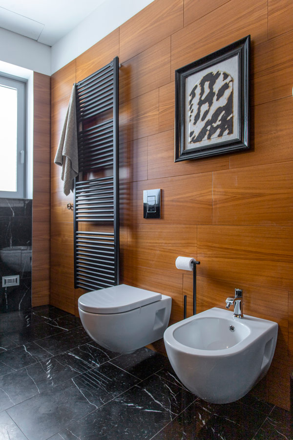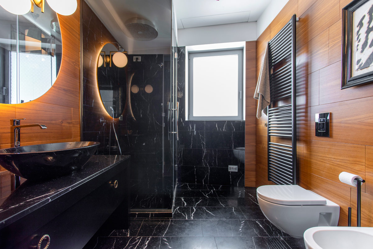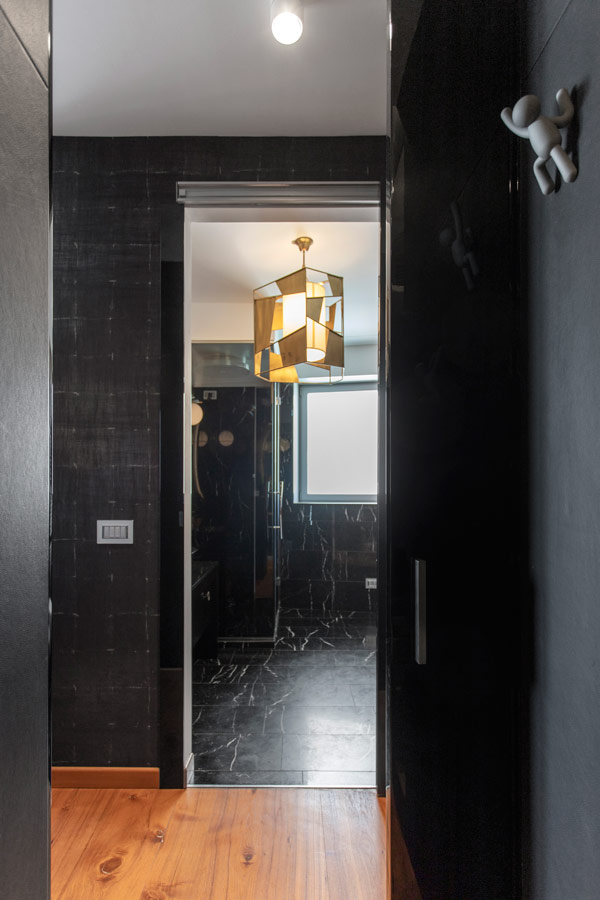Dal disimpegno notte si accede al bagno ospiti realizzato con pavimentazione in Nero Marquinia.