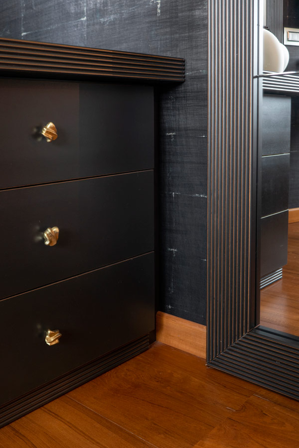 Le finestre, rigorosamente senza tendaggi, sono sottolineate da una cornice in legno trattato con lacca nera successivamente spazzolata per evidenziare l’essenza di base.