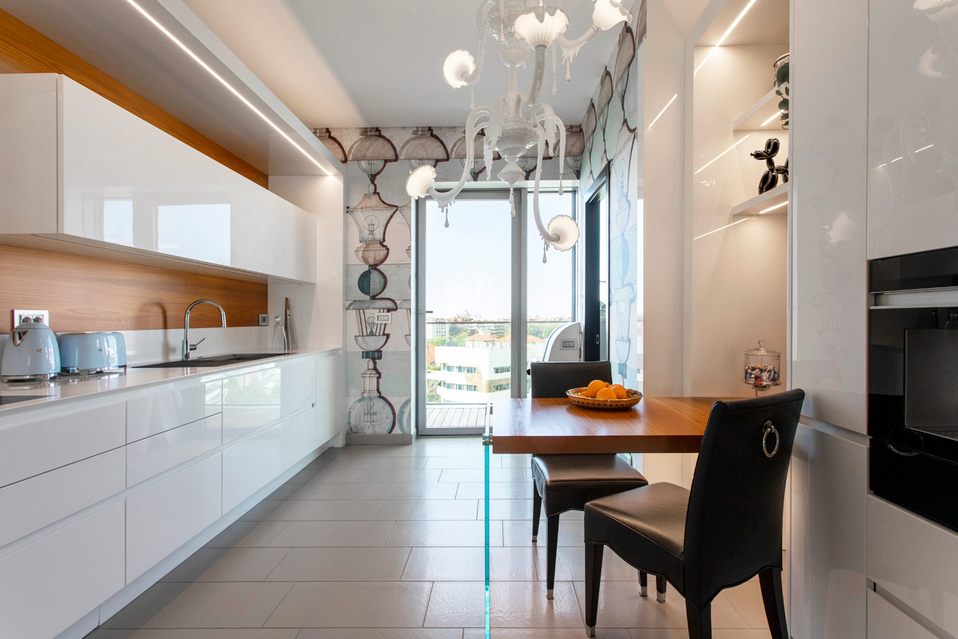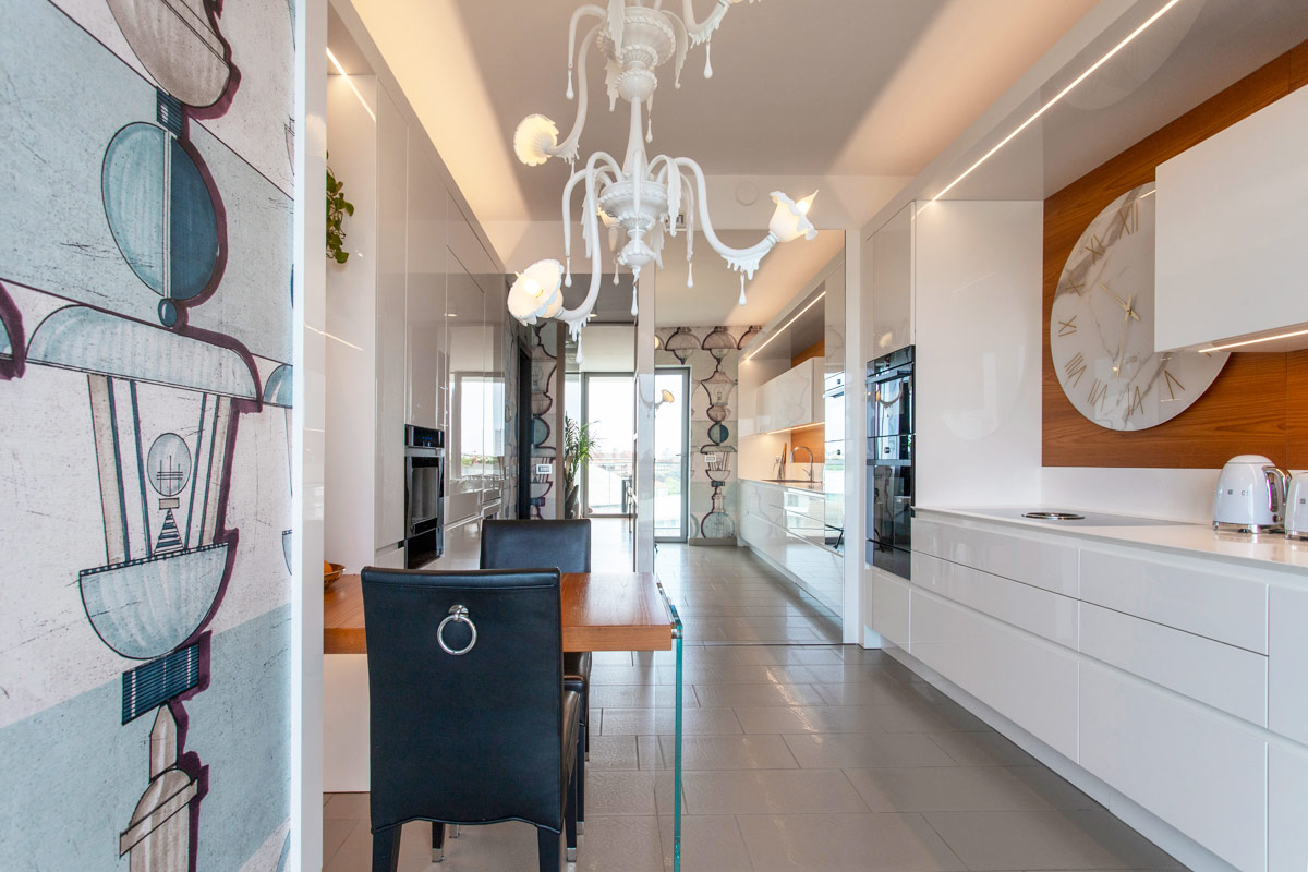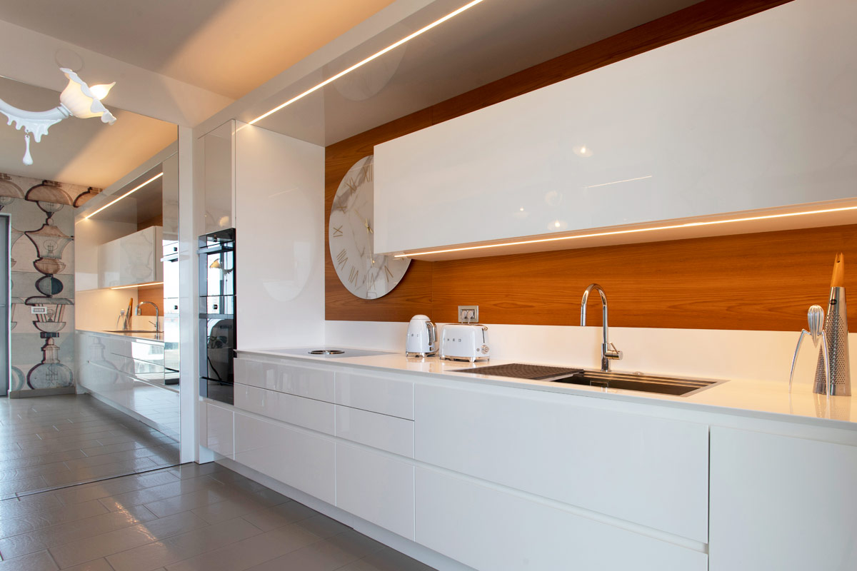 La cucina è realizzata in lacca bianca lucida con piano in corian; la zona cottura con, cappa integrata, ha consentito di utilizzare il macro orologio di Riflessi che risalta sulla parete in teak vicino al pensile.