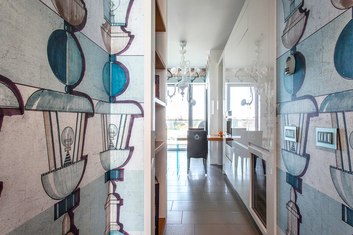 Mediante un disimpegno rivestito con tappezzeria di Momenti (designer Tiziano Boglio)si accede all’ampia ed attrezzata cucina.