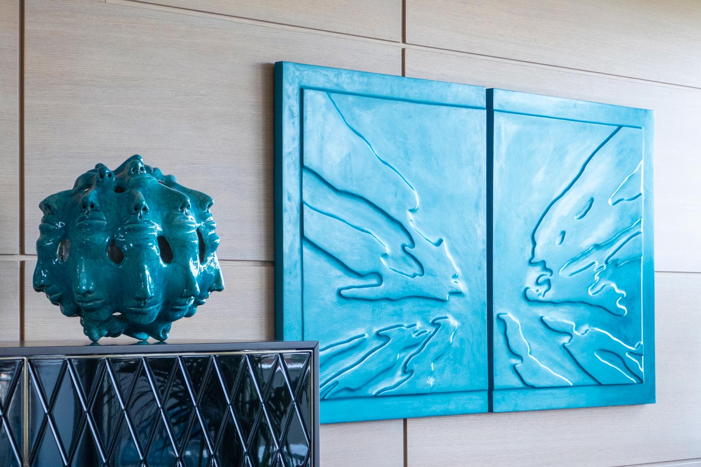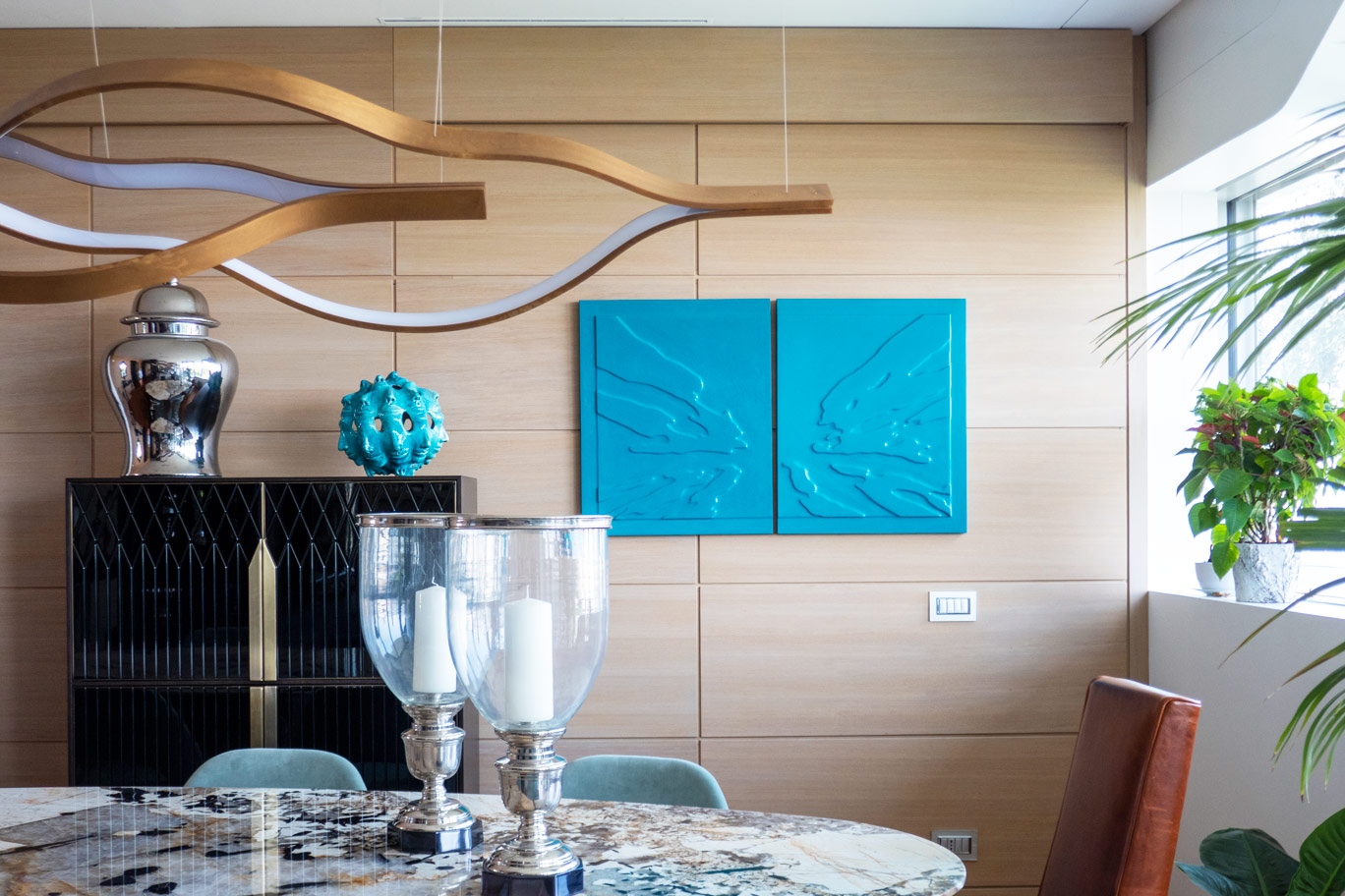 Sulla parete che fa da sfondo alla zona pranzo un dittico di Floriani e sulla credenza verticale “Beyond appearance” in raku di Florine Offergelt.