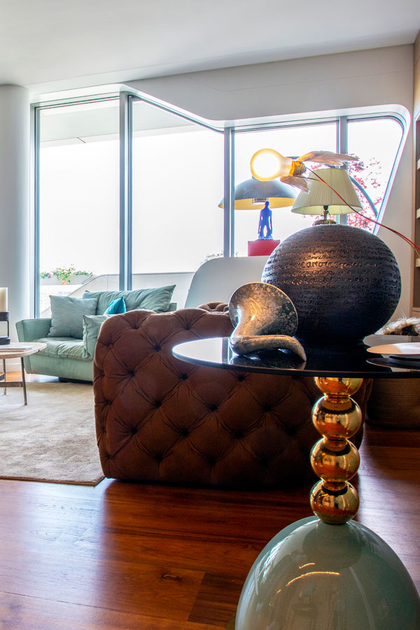 All’ingresso tavolino di Marioni con base in celadon, lampada di Ingo Maurer e scultura sferica di Florine Offergelt.