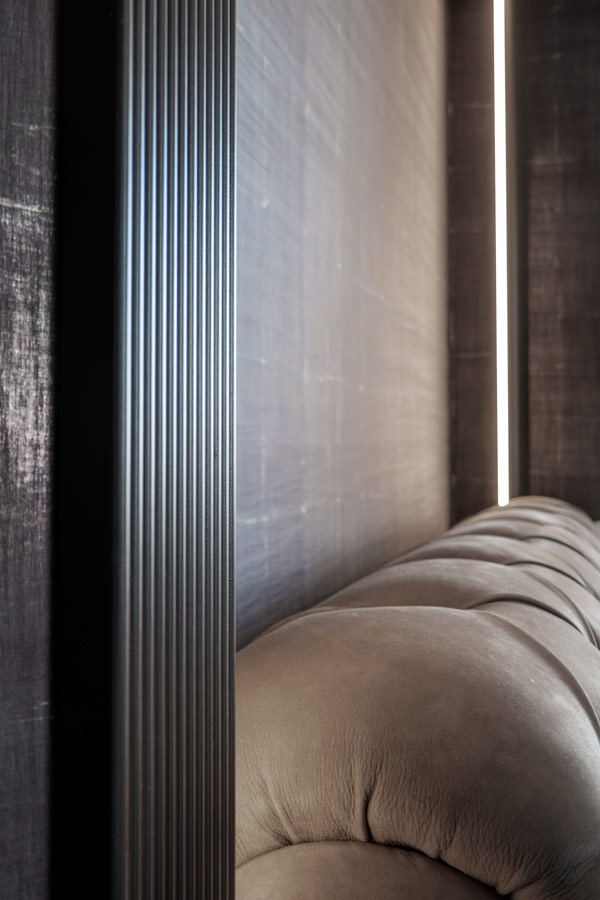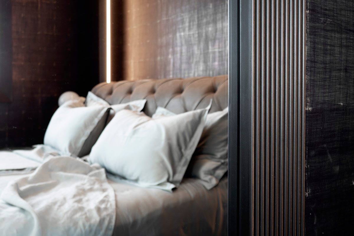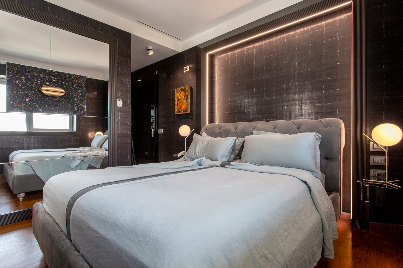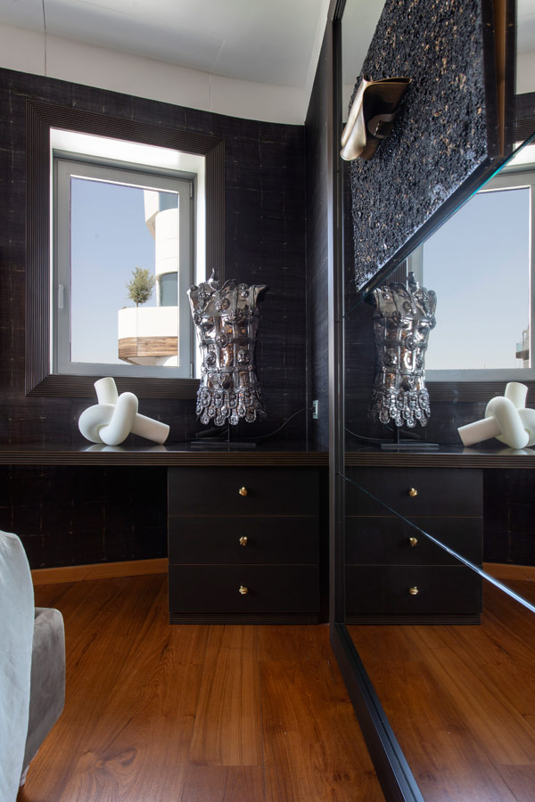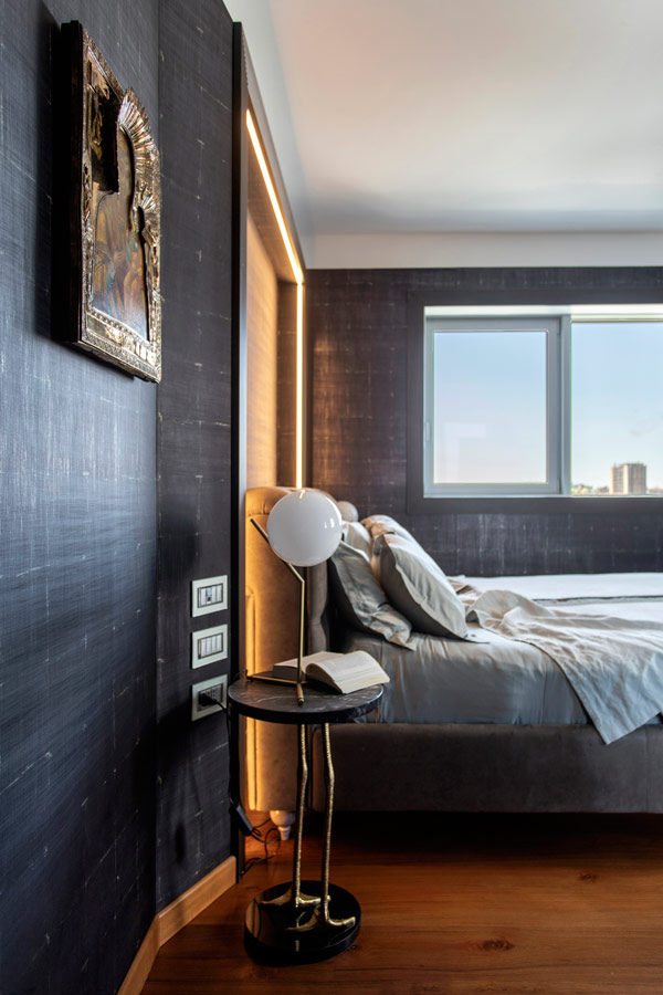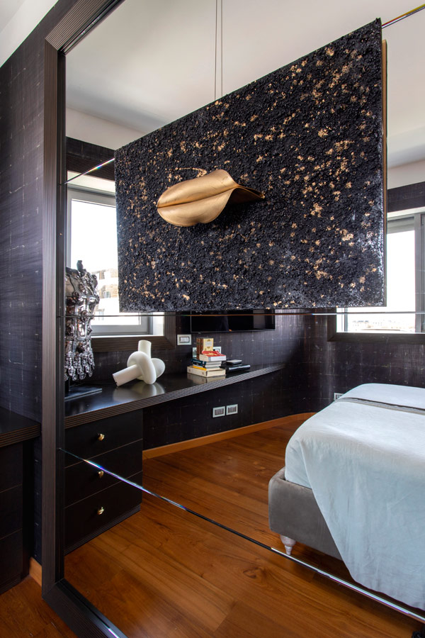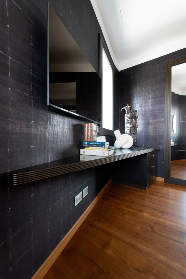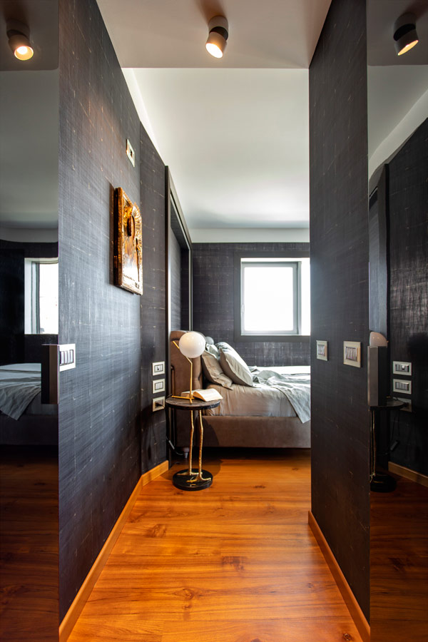 Nella camera da letto padronale la luminosità dell’ambiente ha permesso l’utilizzo di una tappezzeria ( Elitis) di tonalità scura.