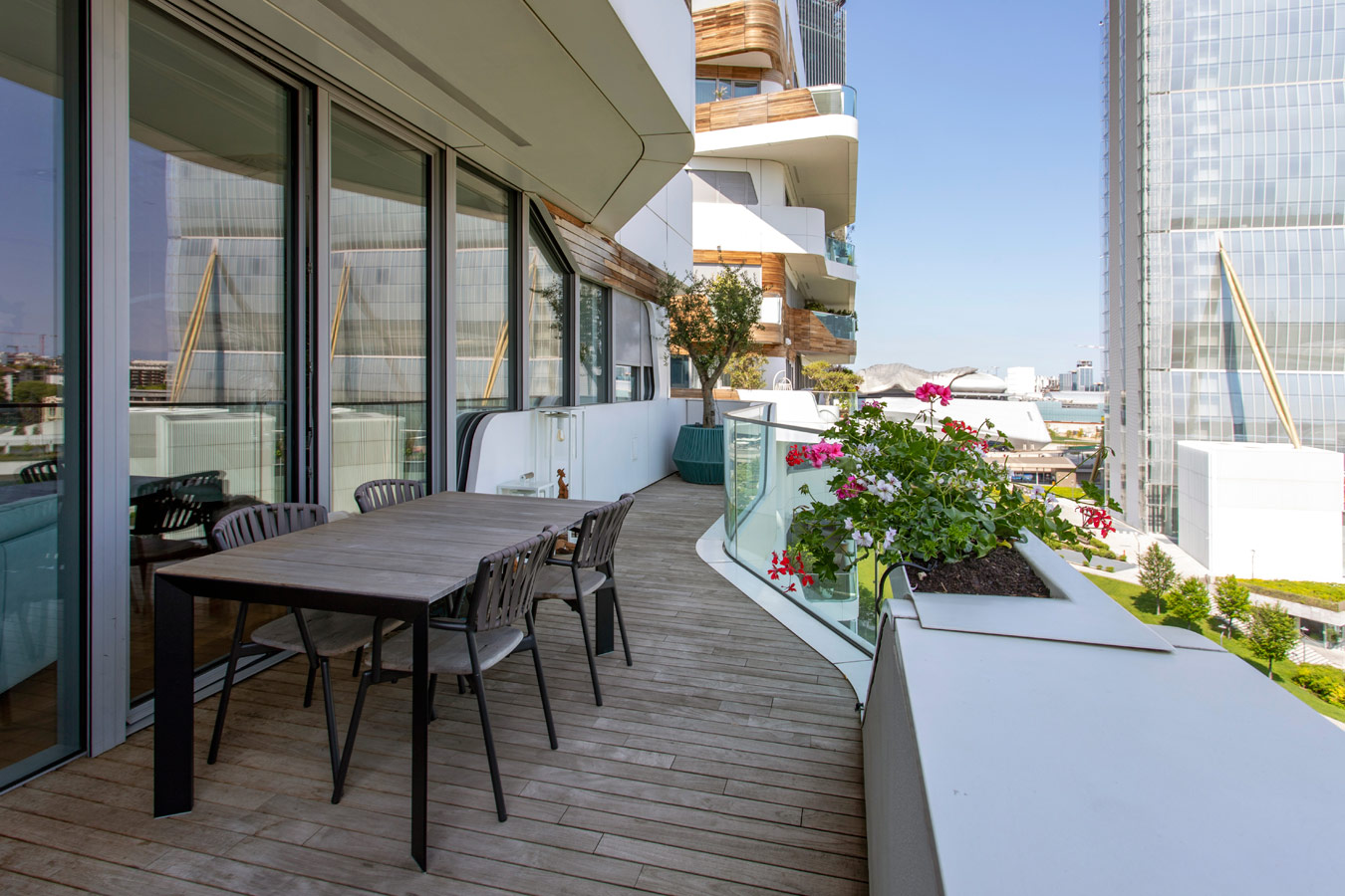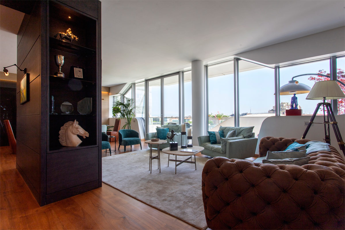 Le ampie vetrate con il caratteristico taglio permettono alla luce di inondare lo spazio soggiorno, in tutta la sua ampiezza, a partire dall’ingresso.