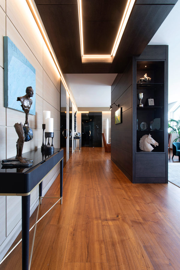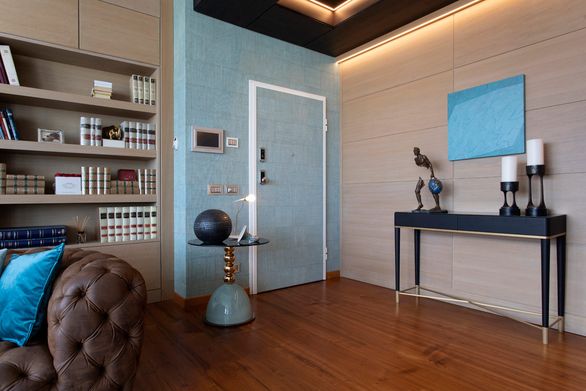 Pavimentazione in teak, pareti in boiserie e, già dall’ingresso, l’accento di colore azzurro- turchese che si presenta, declinato in varie tonalità, nella zona giorno.