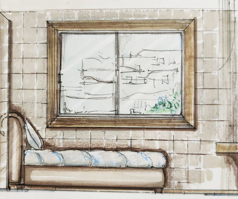 La parete che incornicia la finestra è rivestita con lo stesso materiale, suggerendo una continuità di colore con il soggiorno.