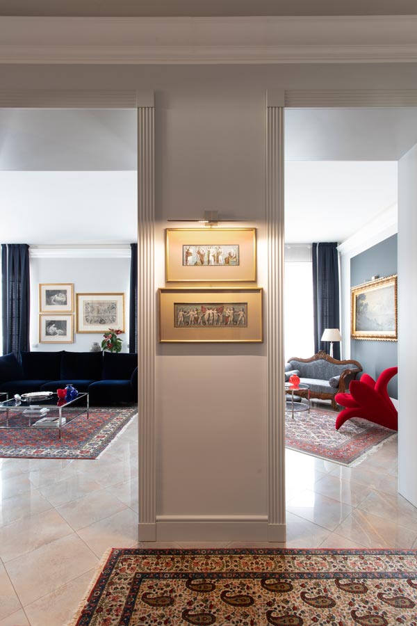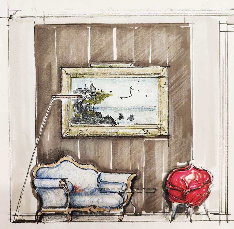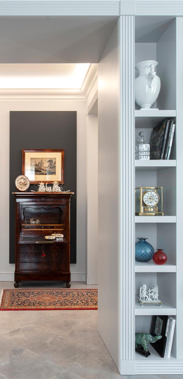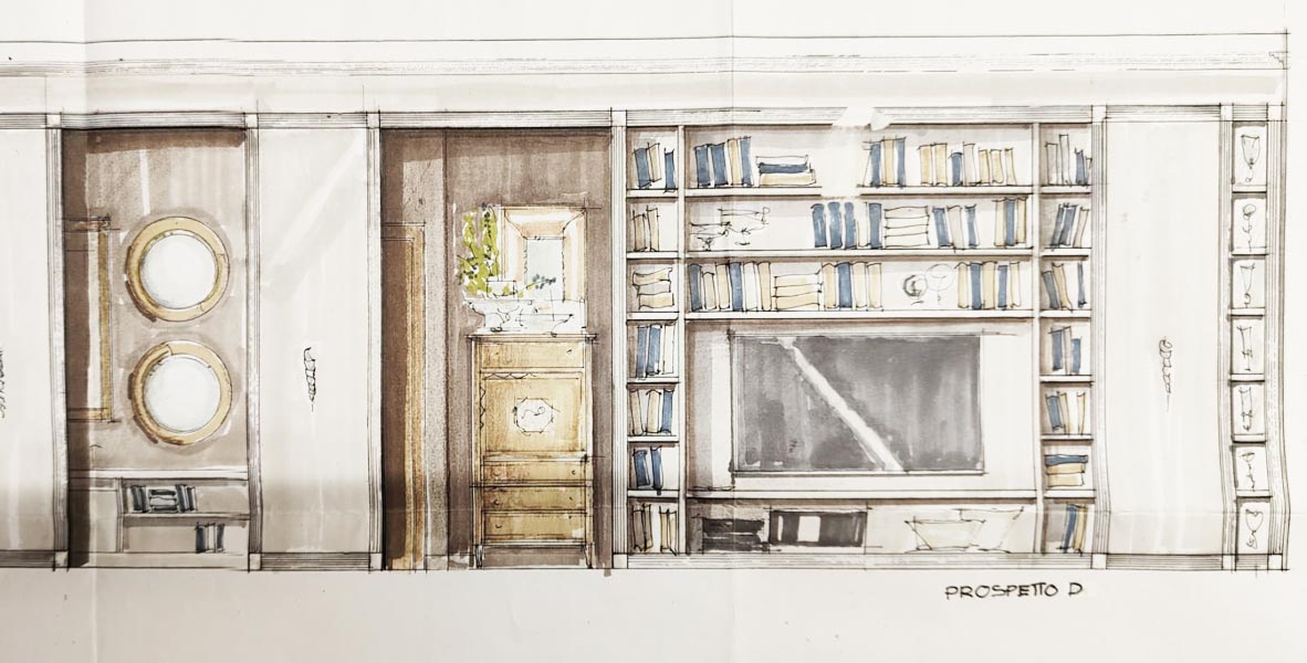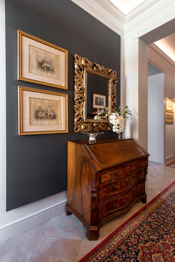 Il filo conduttore è la richiesta della committenza di collocare armoniosamente pezzi di famiglia (arredi, quadri, oggettistica) di varie tipologie appartenenti a differenti periodi stilistici.