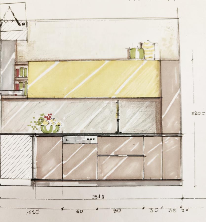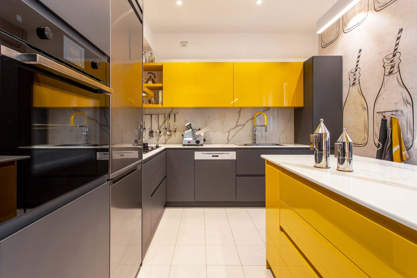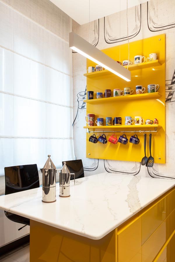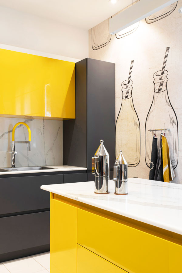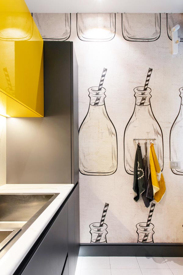 La cucina realizzata a misura riprende il colore grafite presente nel soggiorno con accenti di giallo acceso e pareti rivestite con carta da parati di Momenti.