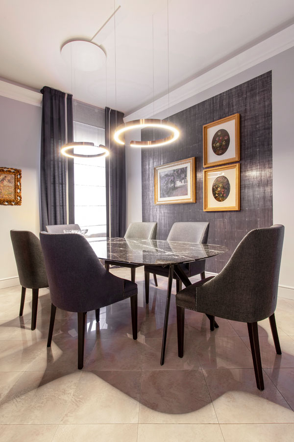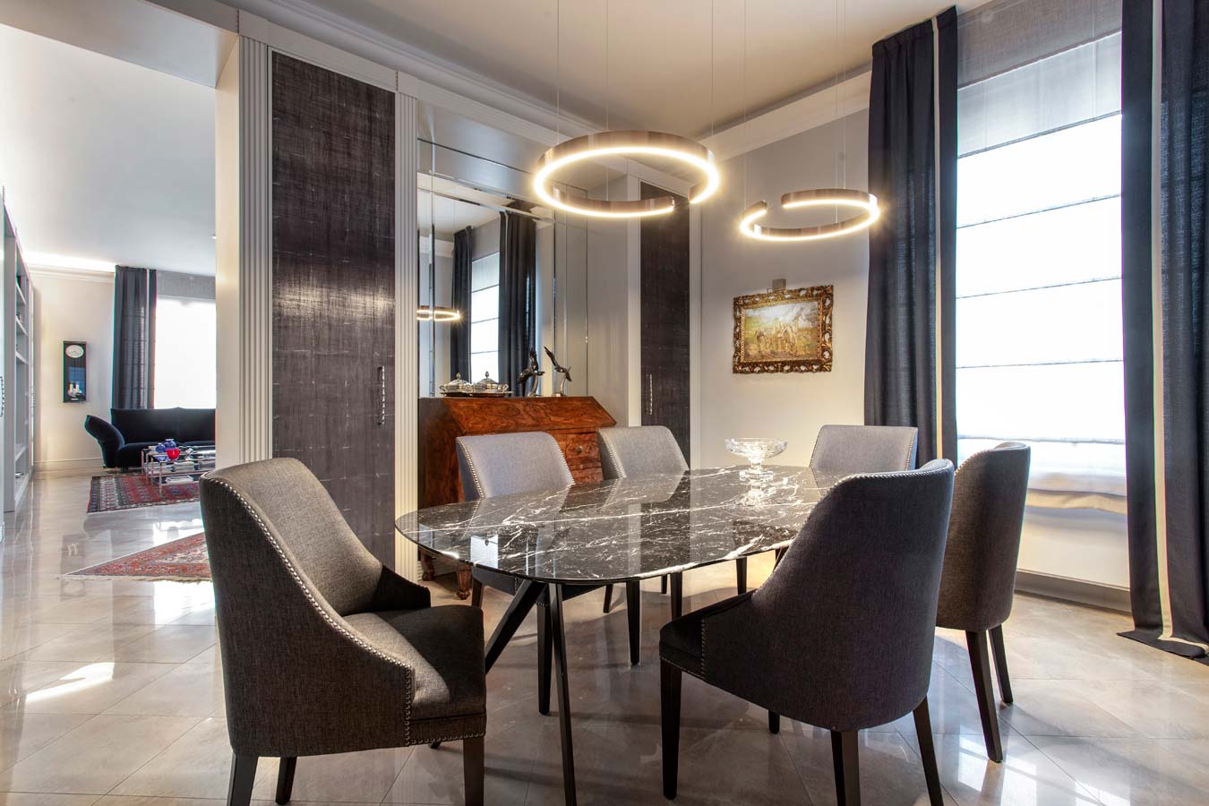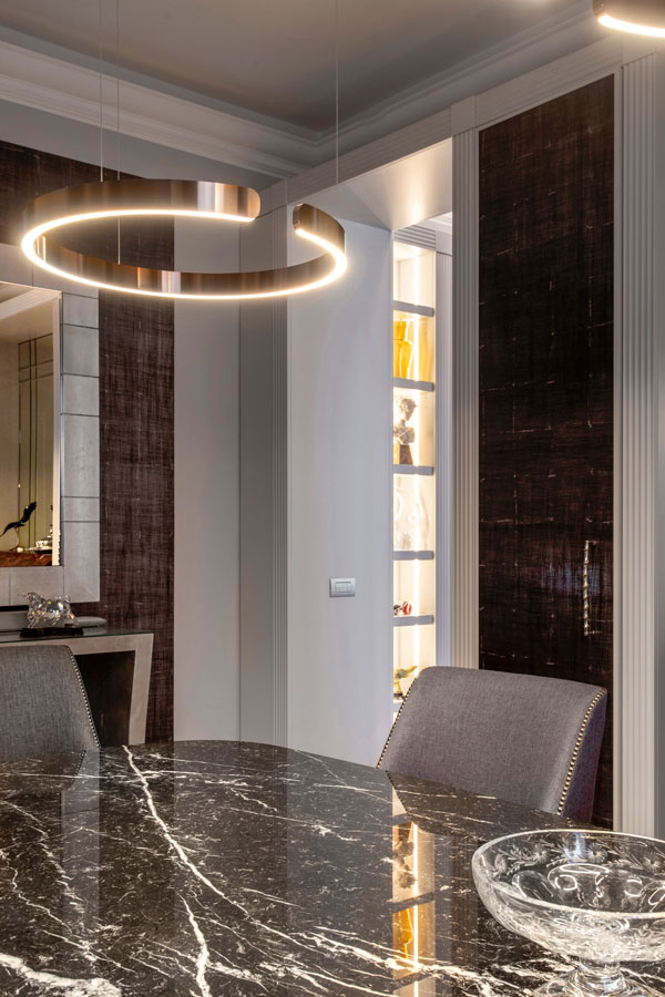 Tavolo in Nero Marquinia di Flexform attorniato da poltroncine sartoriali con borchie cromate. Interessante sistema di illuminazione a sospensione con possibilità di scelta di intensità di illuminazione e temperatura di colore ( Occhio).