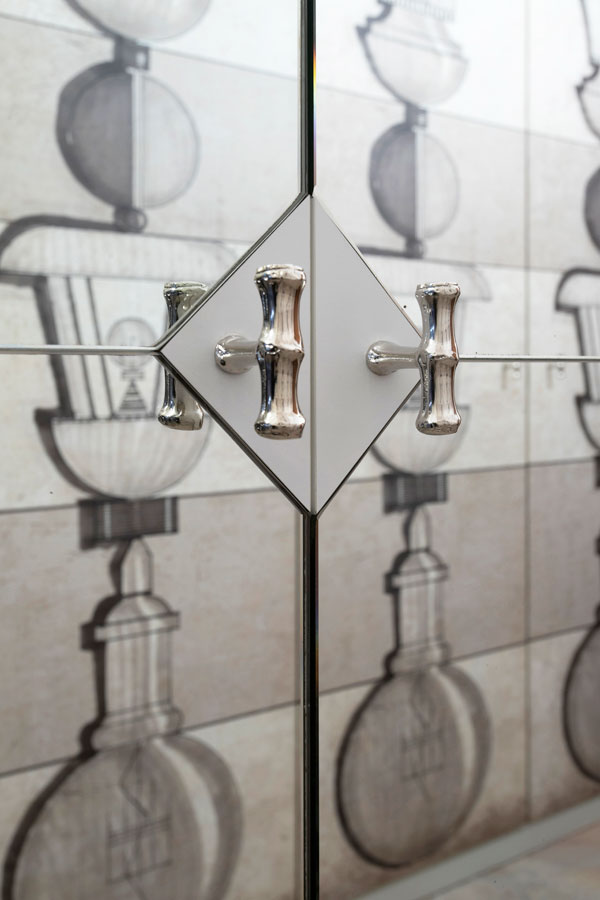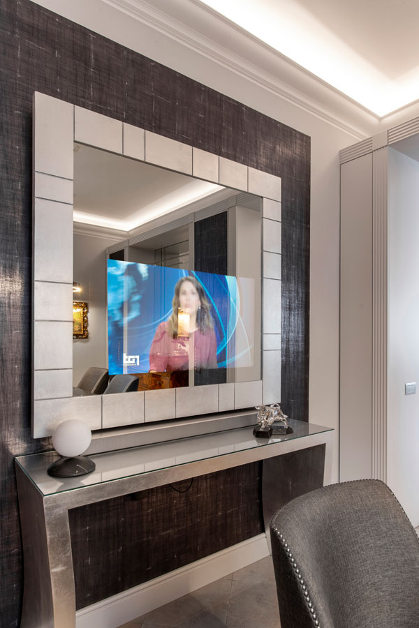La consolle argentata e lo specchio che maschera la TV sono di Spini.