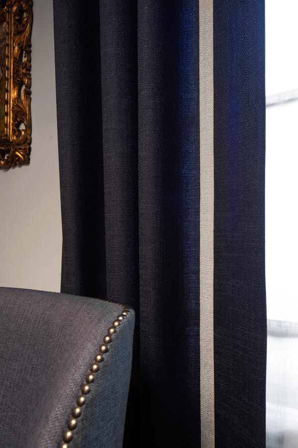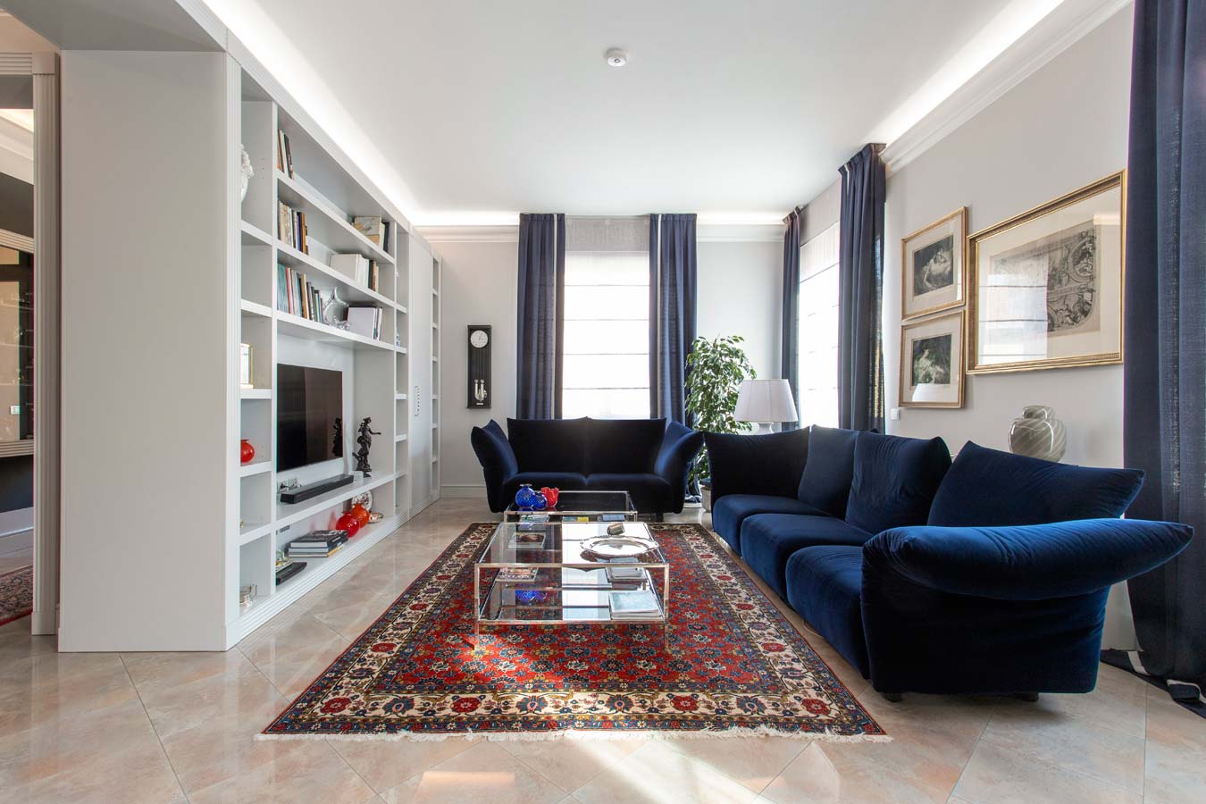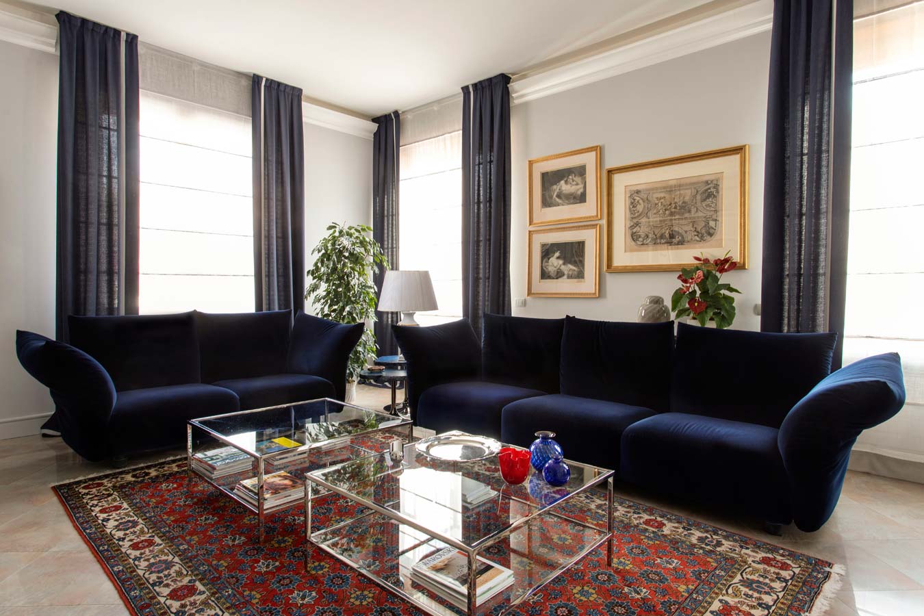 Il velluto blu dei divani (modello Standard di Edra) caratterizza l’ampia zona conversazione TV a completamento della quale c’è il divano Luigi Filippo che dialoga con la poltrona Getsuen sempre di Edra.