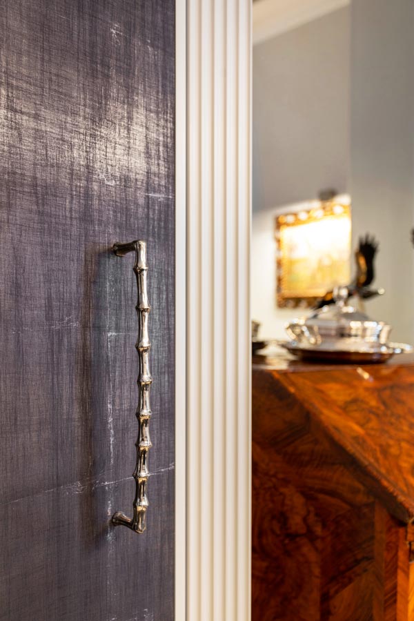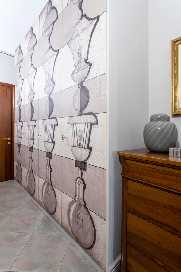 Anche l’armadio del disimpegno ha assunto nuova vita grazie alla tappezzeria sempre di Momenti ideata dall’architetto Tiziano Boglio.