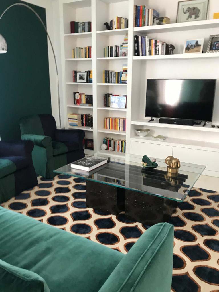 Questo elegante appartamento è caratterizzato da tre colori : il bianco il verde inglese ed il blu. Bianco il pavimento in legno, bianca la boiserie del soggiorno, bianchi i coprifili cannettati che scandiscono i passaggi.