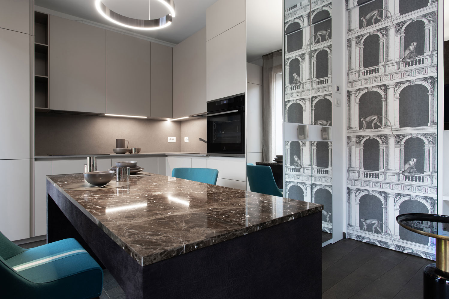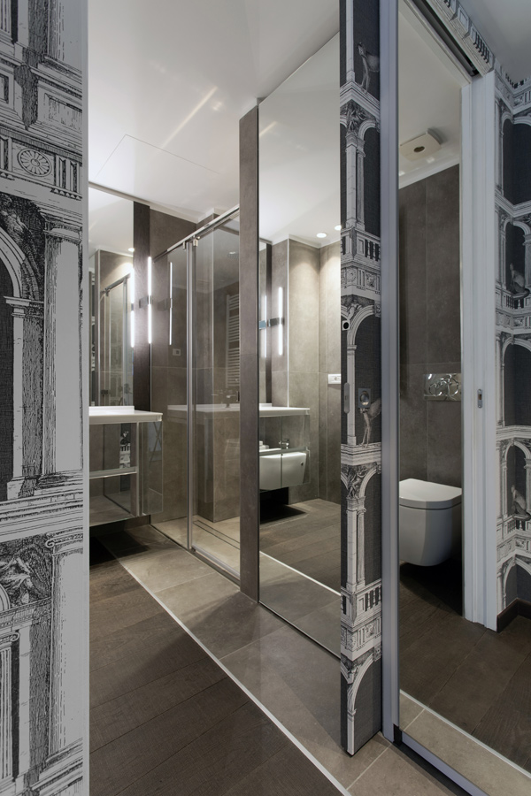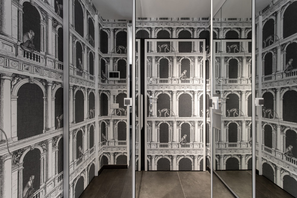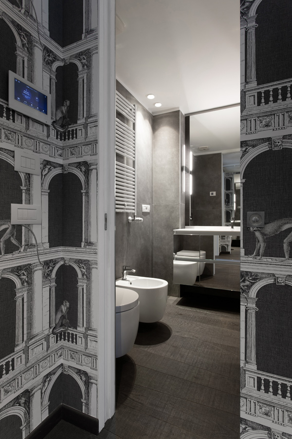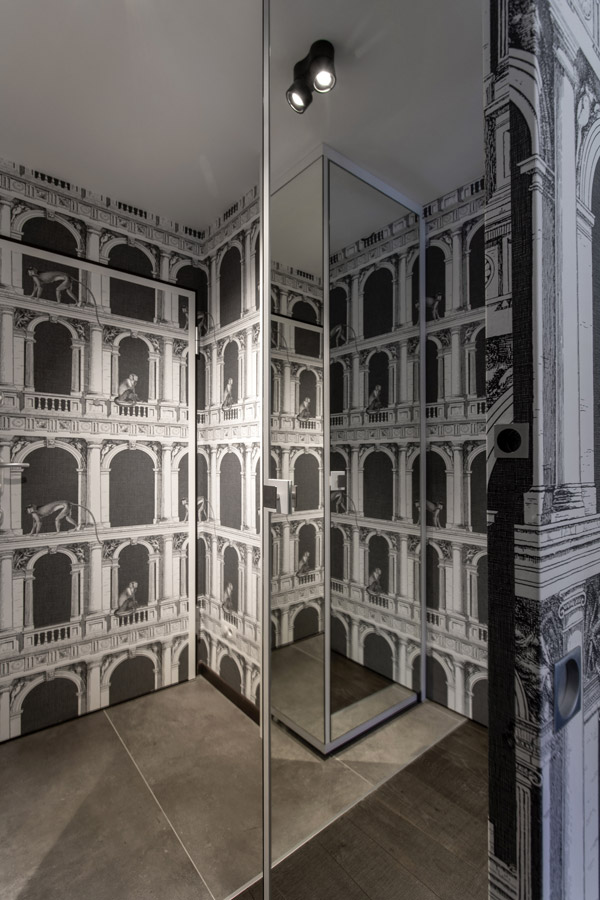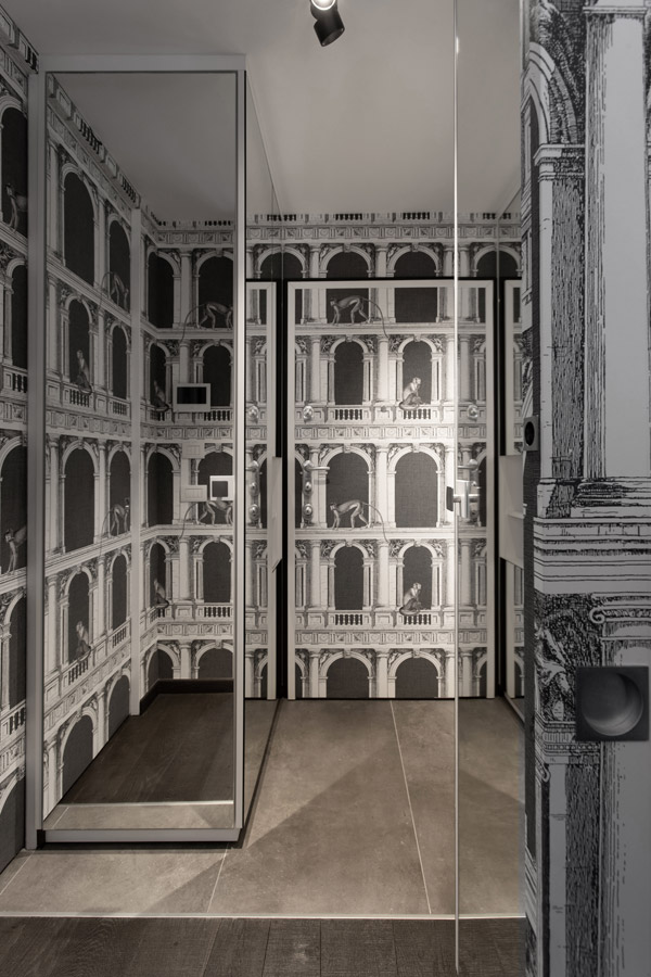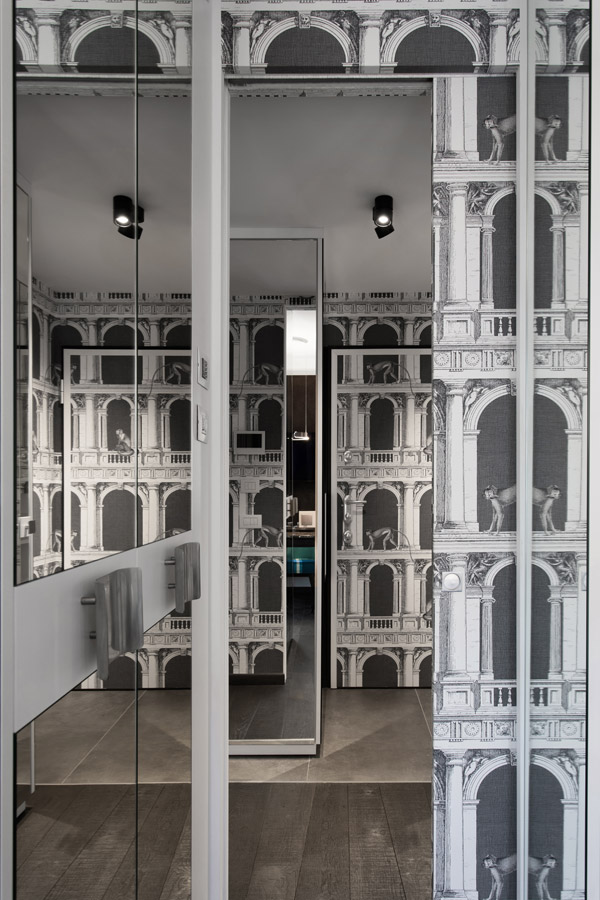 Nell’ingresso, quasi interamente rivestito in tappezzeria Fornasetti, sono presenti mobili per il contenimento abiti, scarpe, aspirapolvere.