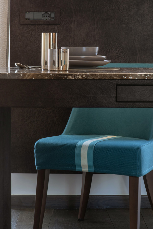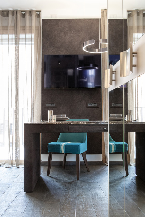 Come sfondo al tavolo la parete Tv, anch’essa rivestita in camoscio, retroilluminata. Anche le mascherine delle prese e interruttori sono rivestite dello stesso materiale.