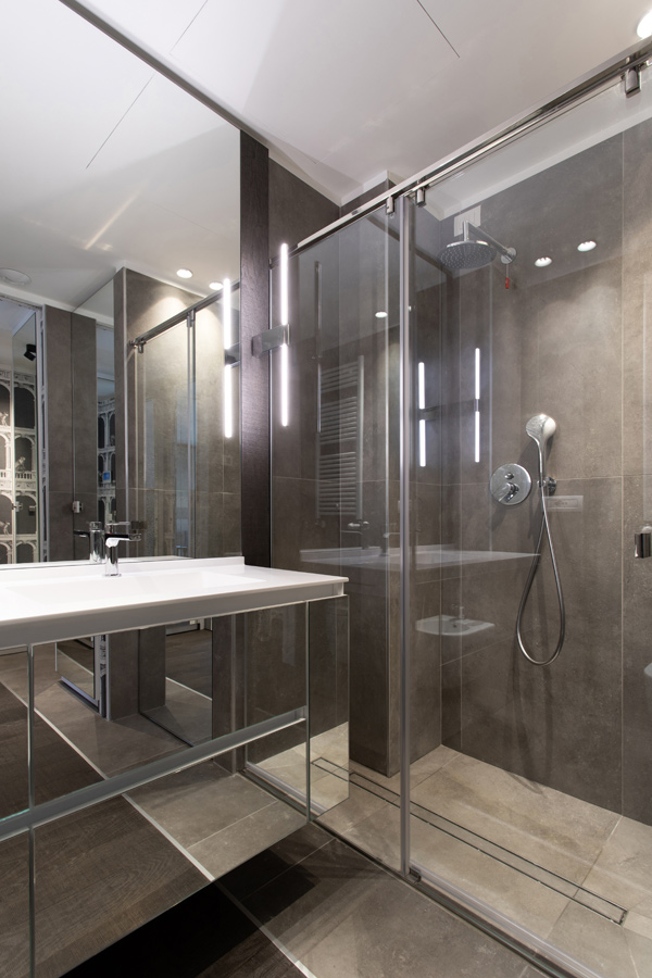 A fianco alla grande doccia un’anta, anch’essa a specchio, che cela lavatrice ed asciugatrice .