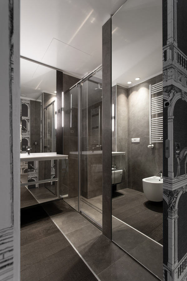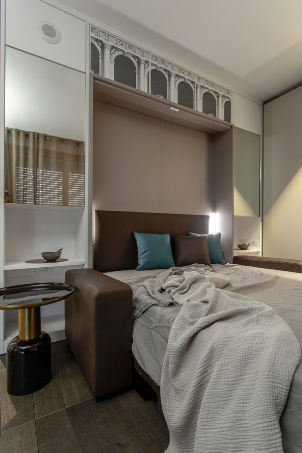 Le porte scorrevoli danno accesso al bagno ed alla zona soggiorno – notte. Alcune ante a specchio riflettono la tappezzeria e dando effetto di continuità.