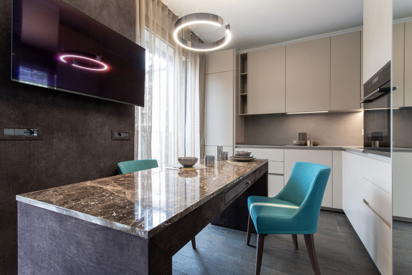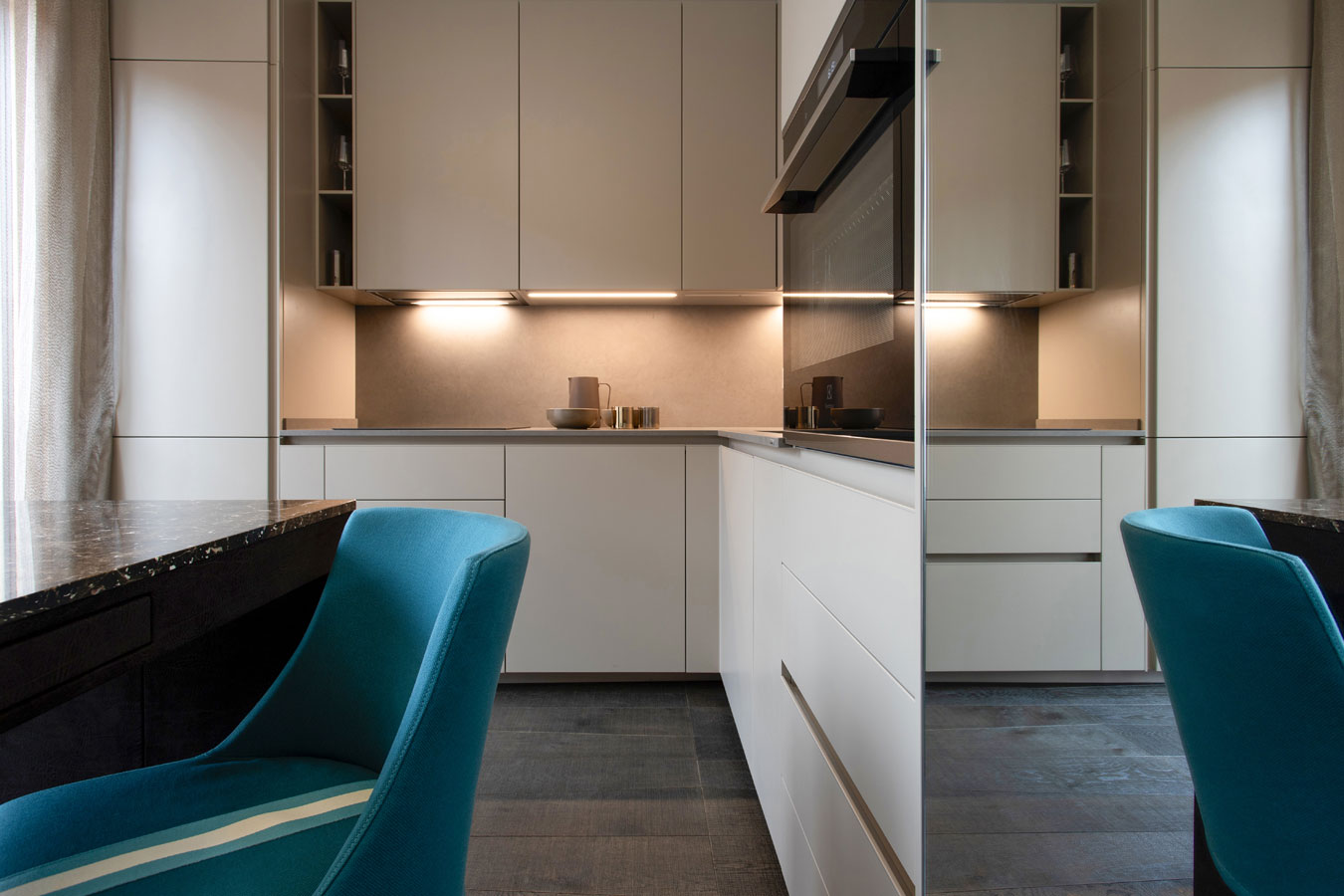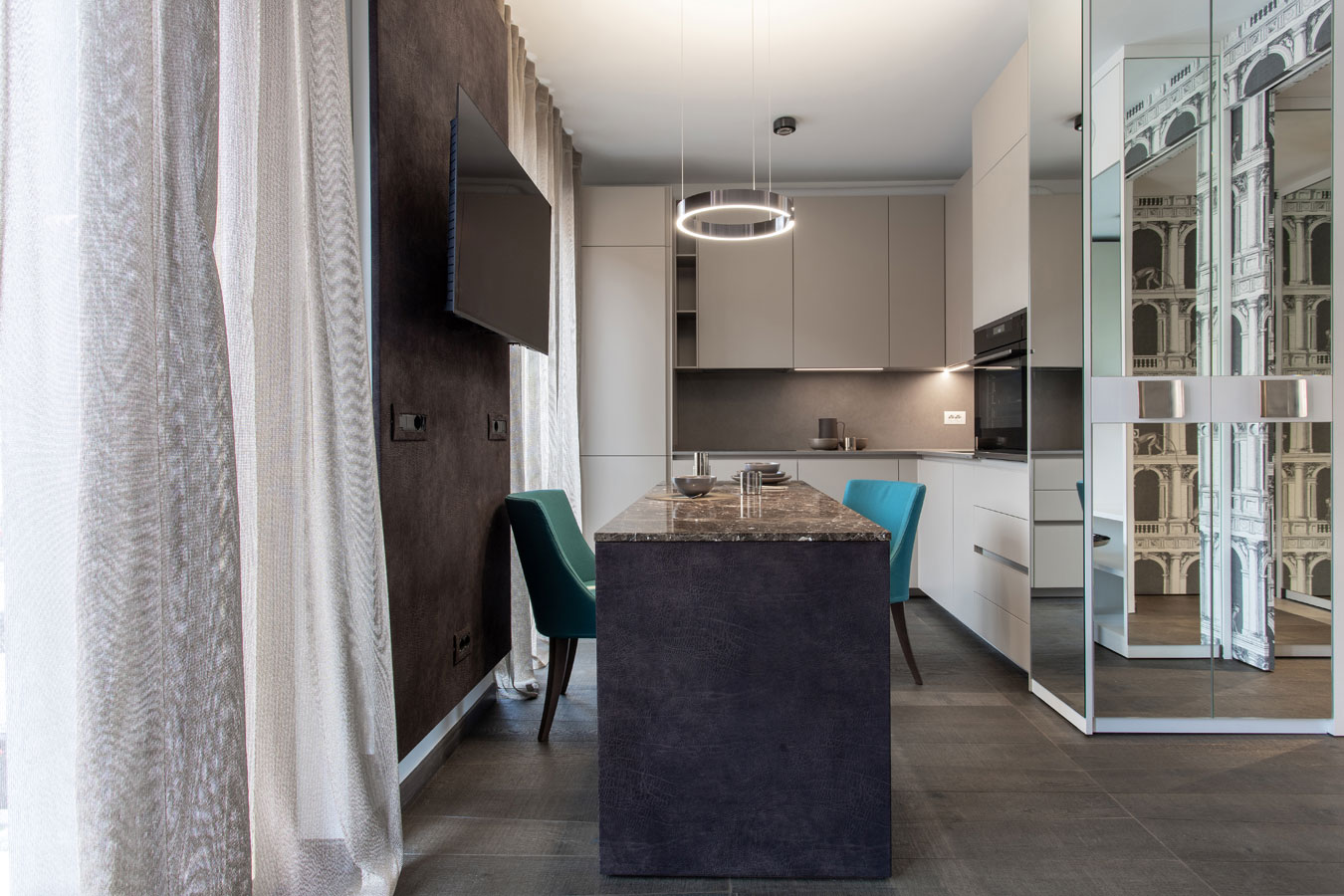 Nella zona giorno troviamo una cucina “monolitica “ color tortora con piano in resina. Il tavolo da pranzo rivestito in camoscio vintage ha un piano in breccia Imperador lucida.