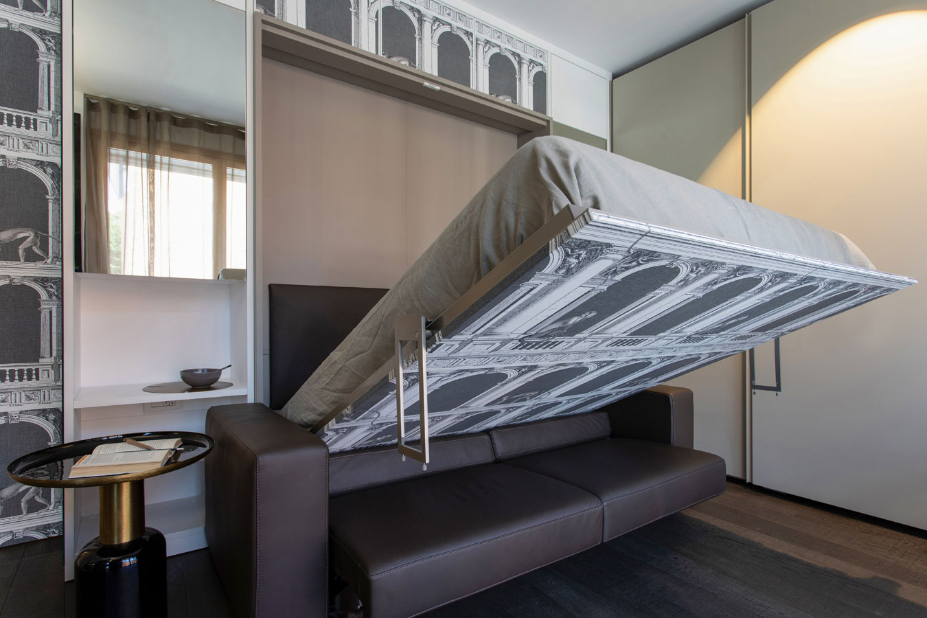 I contenitori esistenti rivestiti a specchio riflettono le grandi vetrate e la zona notte. Alle spalle del divano la “scatola “, rivestita in tappezzeria, contenente un comodo letto matrimoniale dotato di illuminazione laterale.