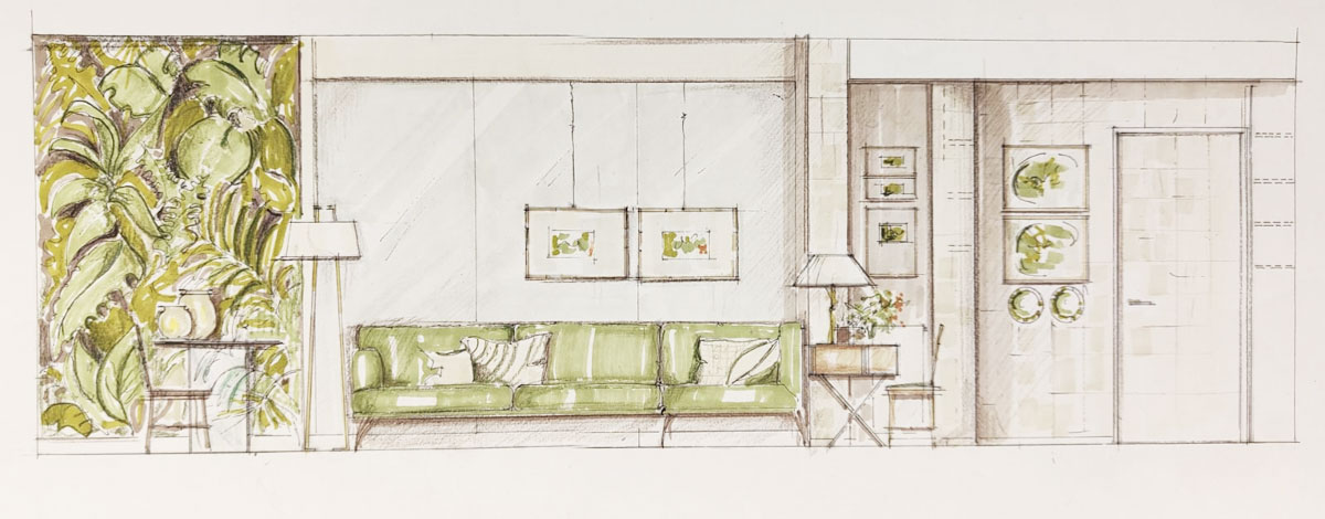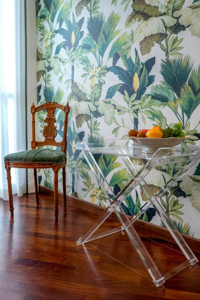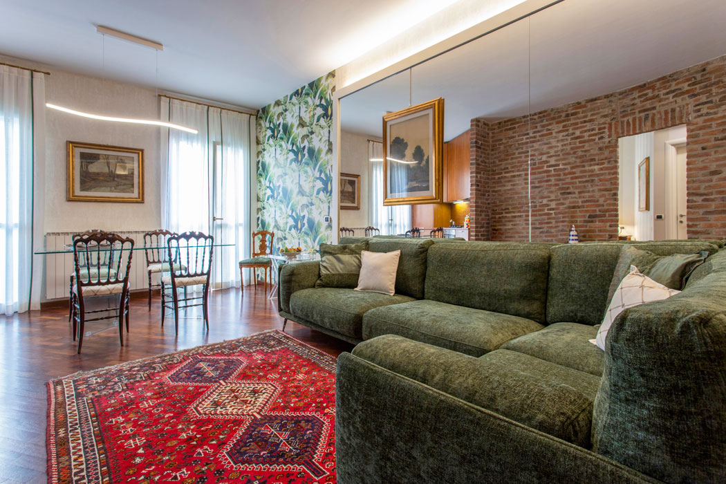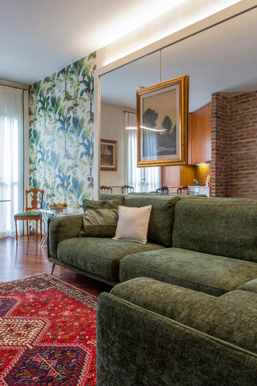 L’avvolgente divano (Ditrè Italia ), rivestito in morbido tessuto di colore verde bosco, dialoga con la carta da parati a motivo botanico (Canovas) che sottolinea lo spazio dedicato alla zona pranzo.