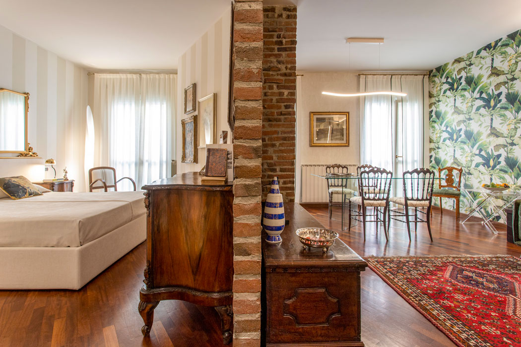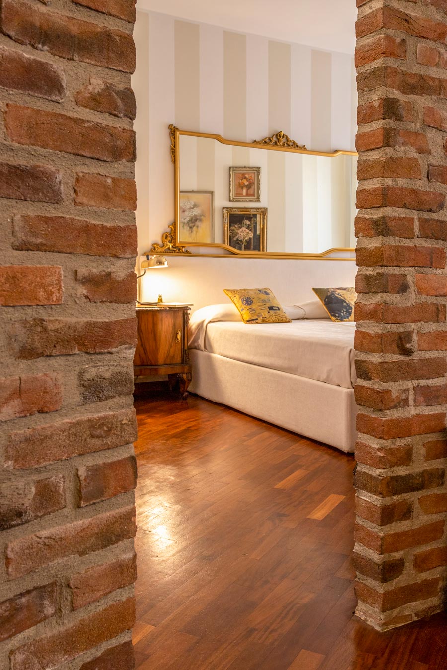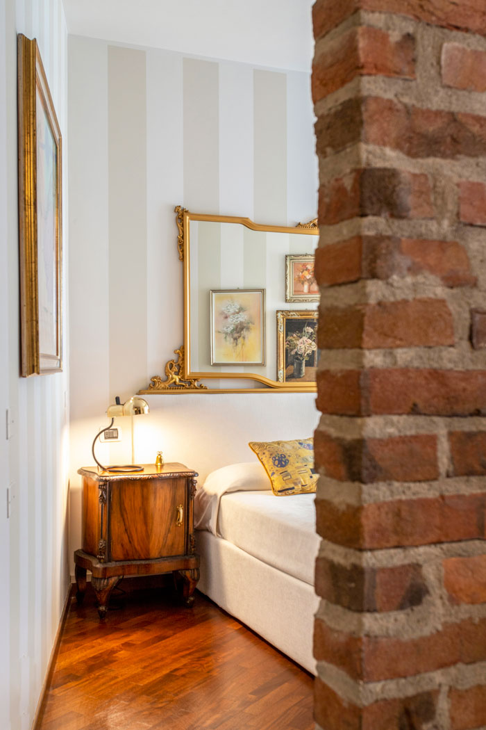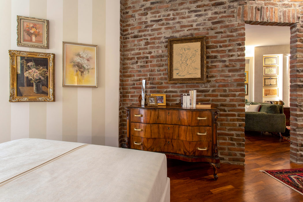Il riutilizzo dei mobili di famiglia si evidenzia in particolare nella zona notte che è divisa dal soggiorno da una parete di mattoni a vista.