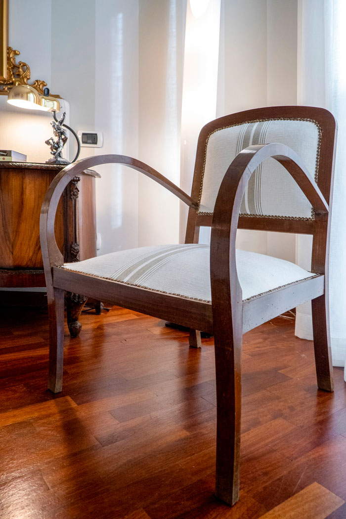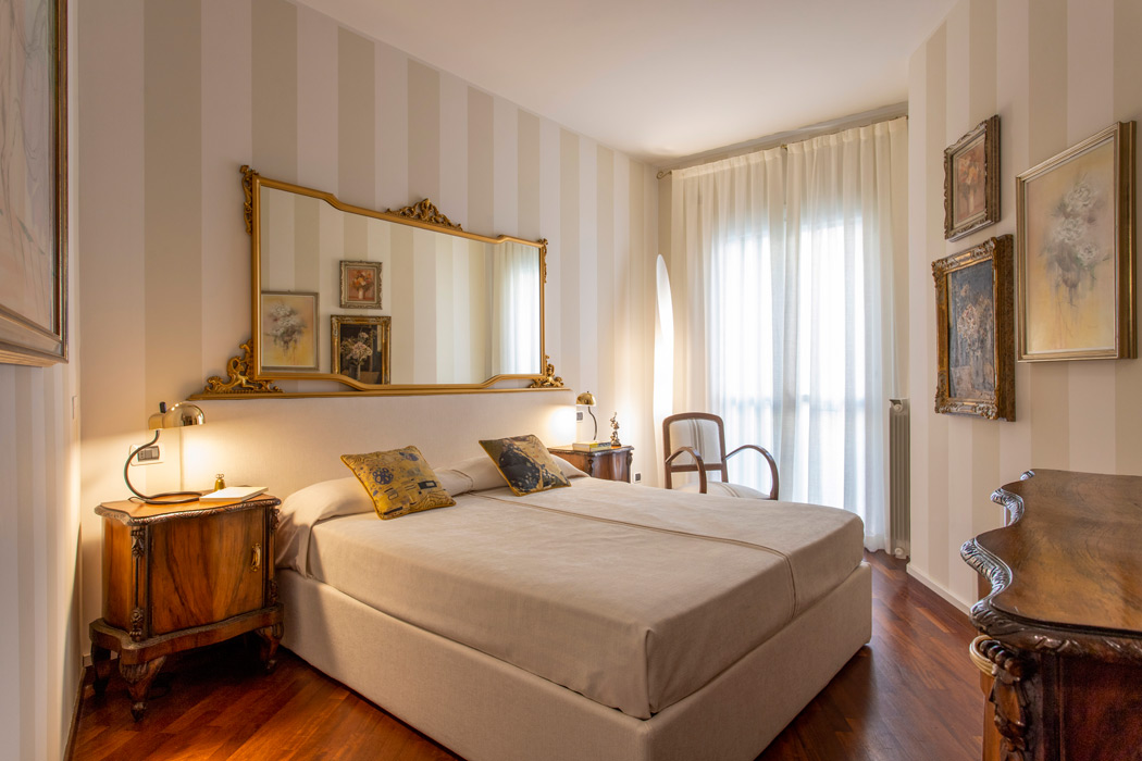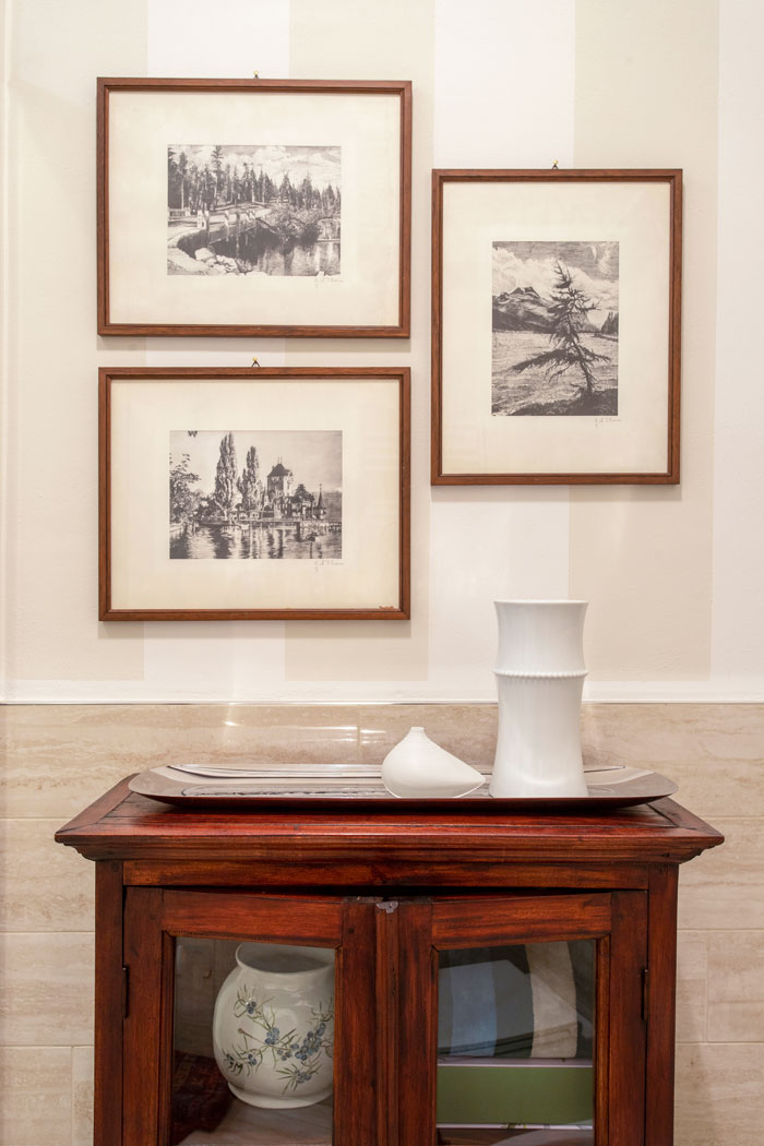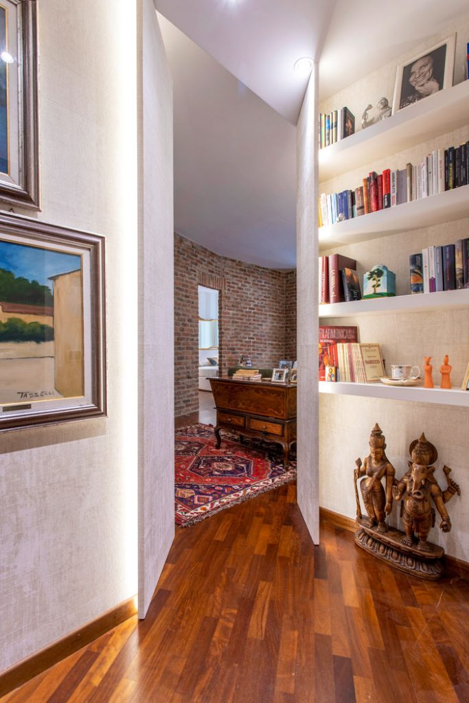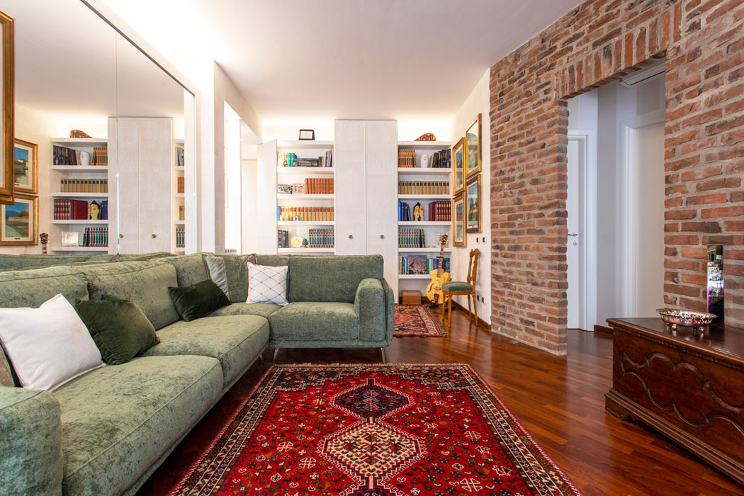 Il riutilizzo dei mobili di famiglia si evidenzia in particolare nella zona notte che è divisa dal soggiorno da una parete di mattoni a vista.