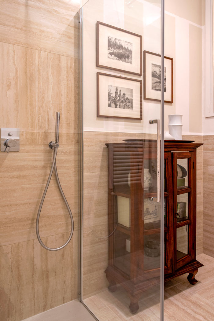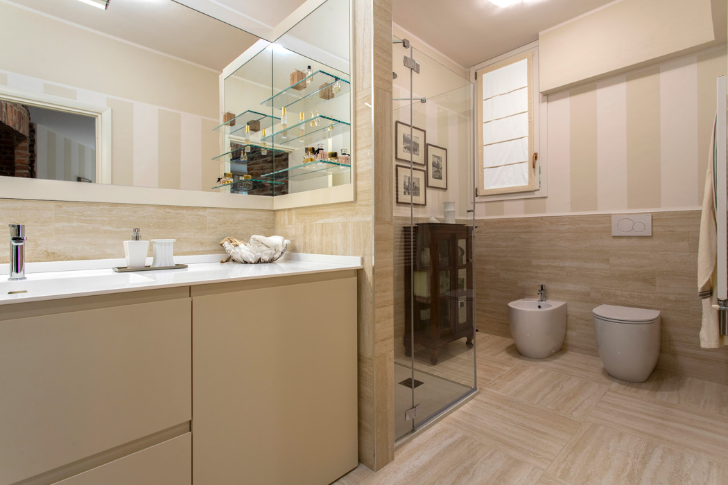 Nel bagno, rivestito in gres porcellanato con finitura travertino, la zona lavabo è stata creata con un contenitore a misura che maschera lo spazio lavatrice. Lo specchio incorniciato riveste i tre lati della nicchia.