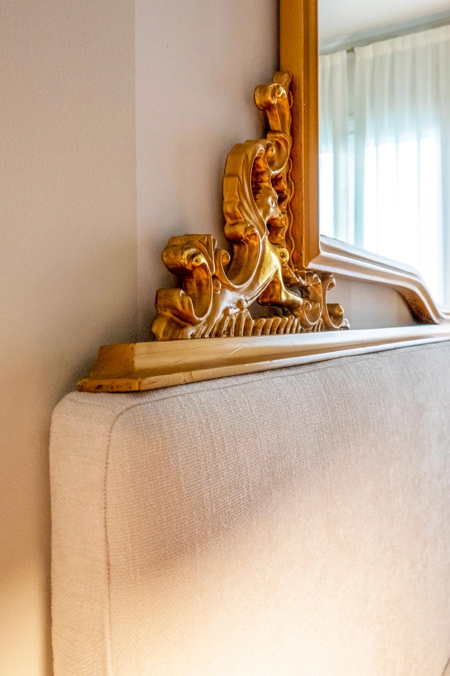 La specchiera appoggia su di una struttura creata a misura e rivestita con lo stesso tessuto del letto.